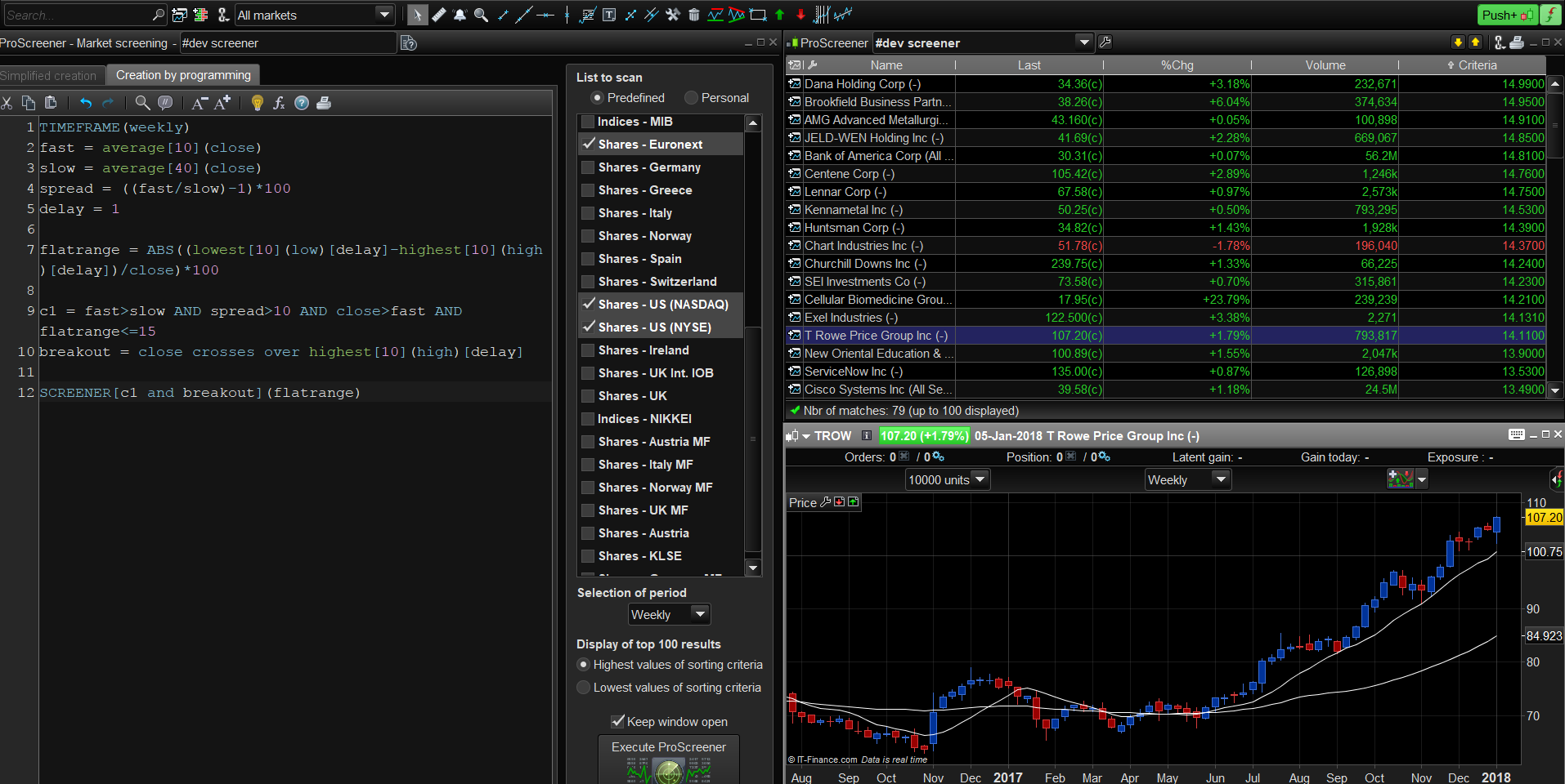 This second version add a “breakout” condition of our flat base consolidation, you are right this screener is very powerful in a weekly timeframe: