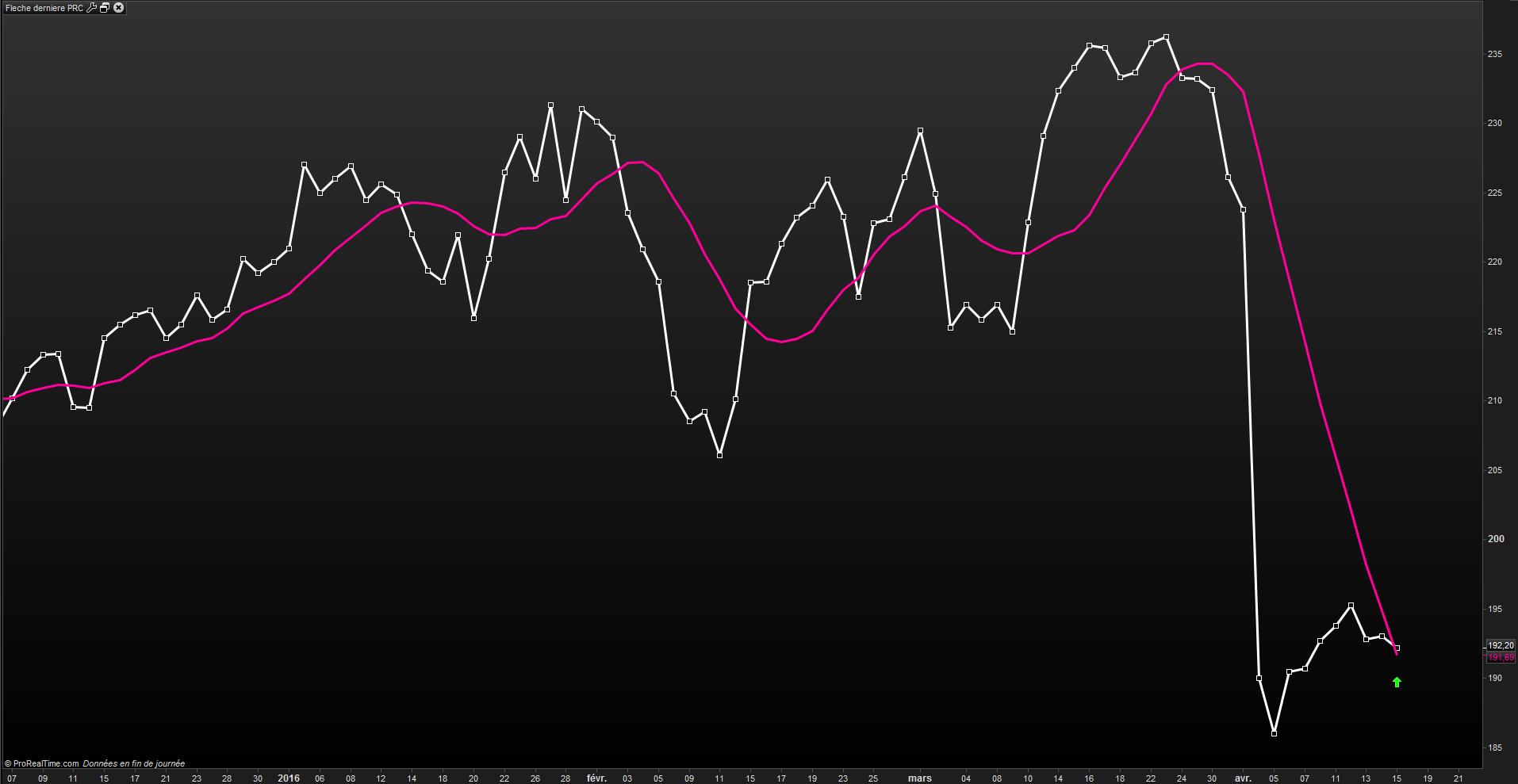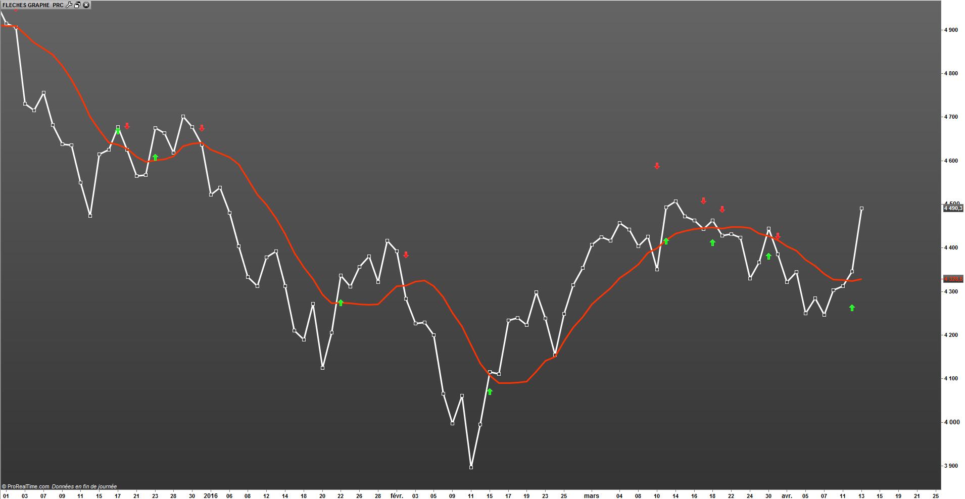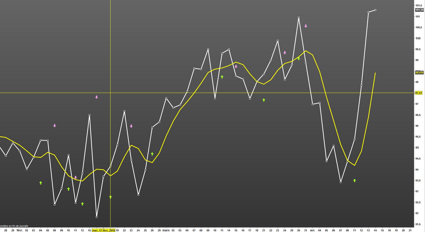 Pour comprendre le principe : le croisement à la hausse et à la baisse d’un prix sur une moyenne mobile renvois une flèche sur le graphe principal