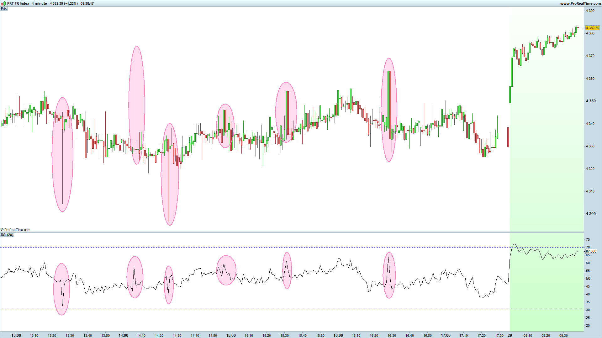 Illustration ce matin de l’impact du flux erratique du FRIDX sur les indicateurs, ici un RSI20 qui devient de fait illisible.