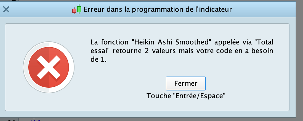 Bonjour, pour faire face à cette erreur, il est probable qu’au moins un des 2 codes appelés par CALL et non fournis dans le message, “exemple adx” ou “heikin ashi smoothed”, ait deux valeurs retournées par sa ligne return.