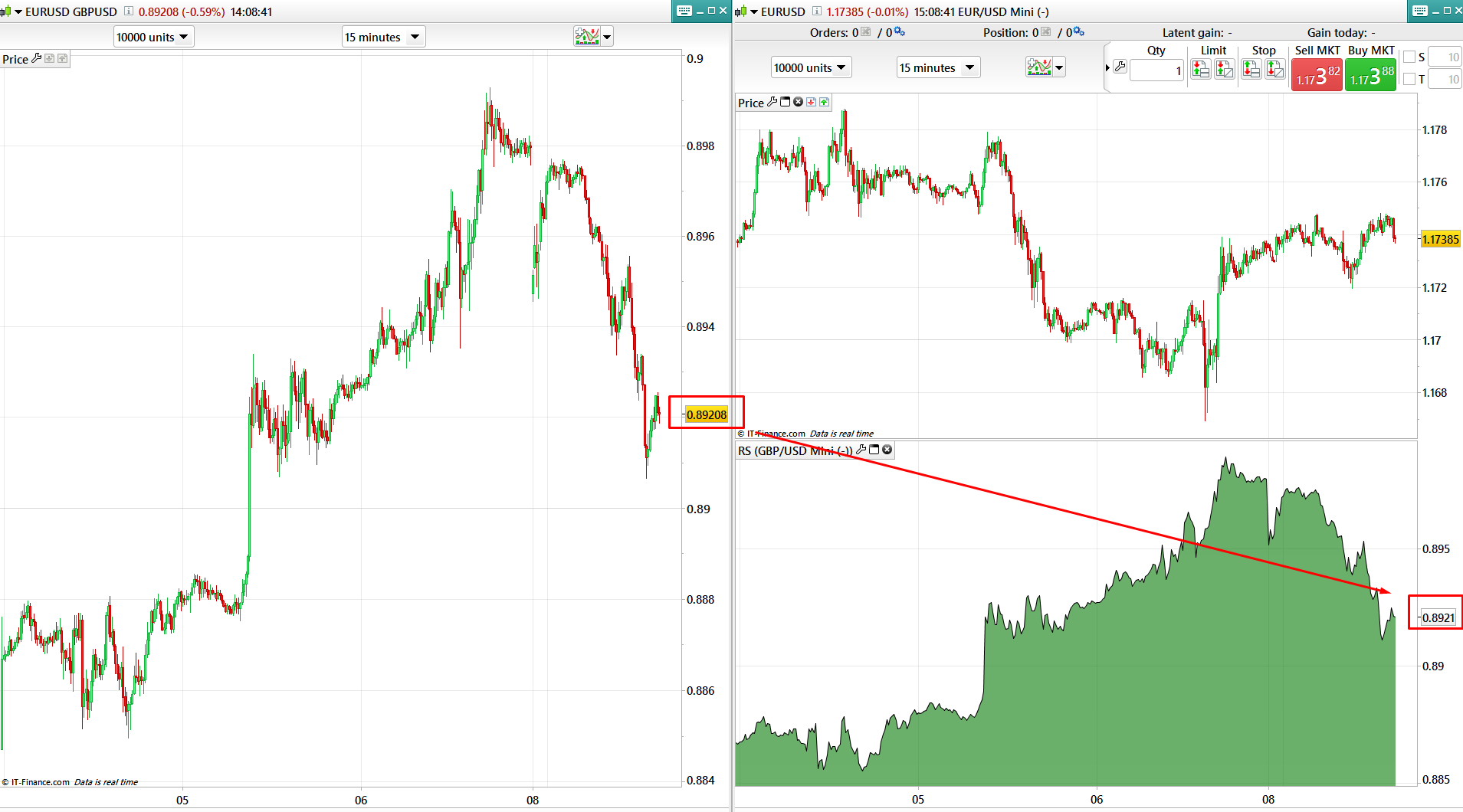 Cela se vérifie en utilisant l’indicateur de “force relative” et si on le compare avec un graphique de spread, comme ici dans l’exemple, une division de l’EURUSD par le GBPUSD, on obtient bien les mêmes valeurs.