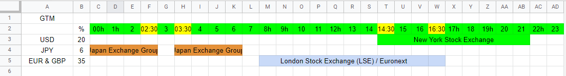 I am trying to make a small table with the overlapping hours (in GTM) of the main stock exchanges in volume on the main currencies (USD, EUR, GBP, JPY) (it is me who considers that it is the main currencies I can of course be wrong but it is 4 currencies suit me)