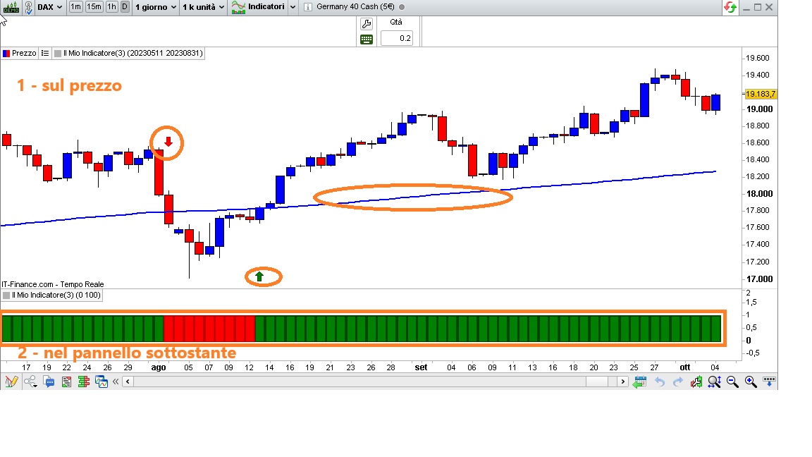 oppure puoi fare due copie dello stesso indicatore, con istruzioni leggermente diverse per fare in modo che uno si possa mettere sui prezzi e l’altro nel pannello sottostante.