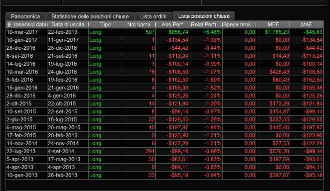 indipendentemente dal fatto che il pattern utilizzato ancora non funziona, mi trovo ad avere tutta una serie di operazioni in perdita (anche se molte dovrebbero essere in utile 😉 ) che se rispettassero la formula dovrebbero avere tutte una perdita di 100 euro ognuna.
