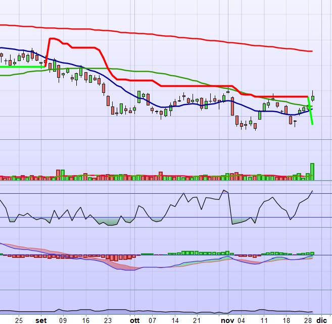 ho creato il seguente banale screener che estrae i titoli che sono passati da ieri ad oggi, da supertrend rosso a supertrend verde, cioè stanno andando in trend positivo:
