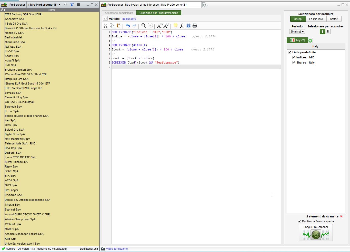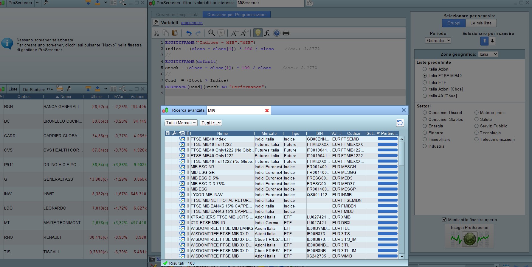 Vorrei sapere se lo screener in questione mi permette di evidenziare tutte le azioni appartenenti ad un Indice (ad esempio Ftse Mib40, Nasdaq, Azioni Nyce) che hanno una forza relativa maggiore rispetto all’indice di riferimento e se posso impostare io il parametro della forza relativa (ad esempio sopra/sotto l’indice di un +/- 10%).