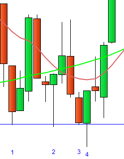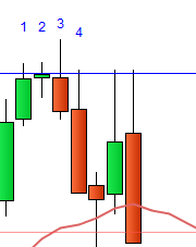 For the support signal I search in a range of maximum 8 candels where I want a signal if a connection can be made by a horizontal line with 4 candels that have a upper wick as in the picture