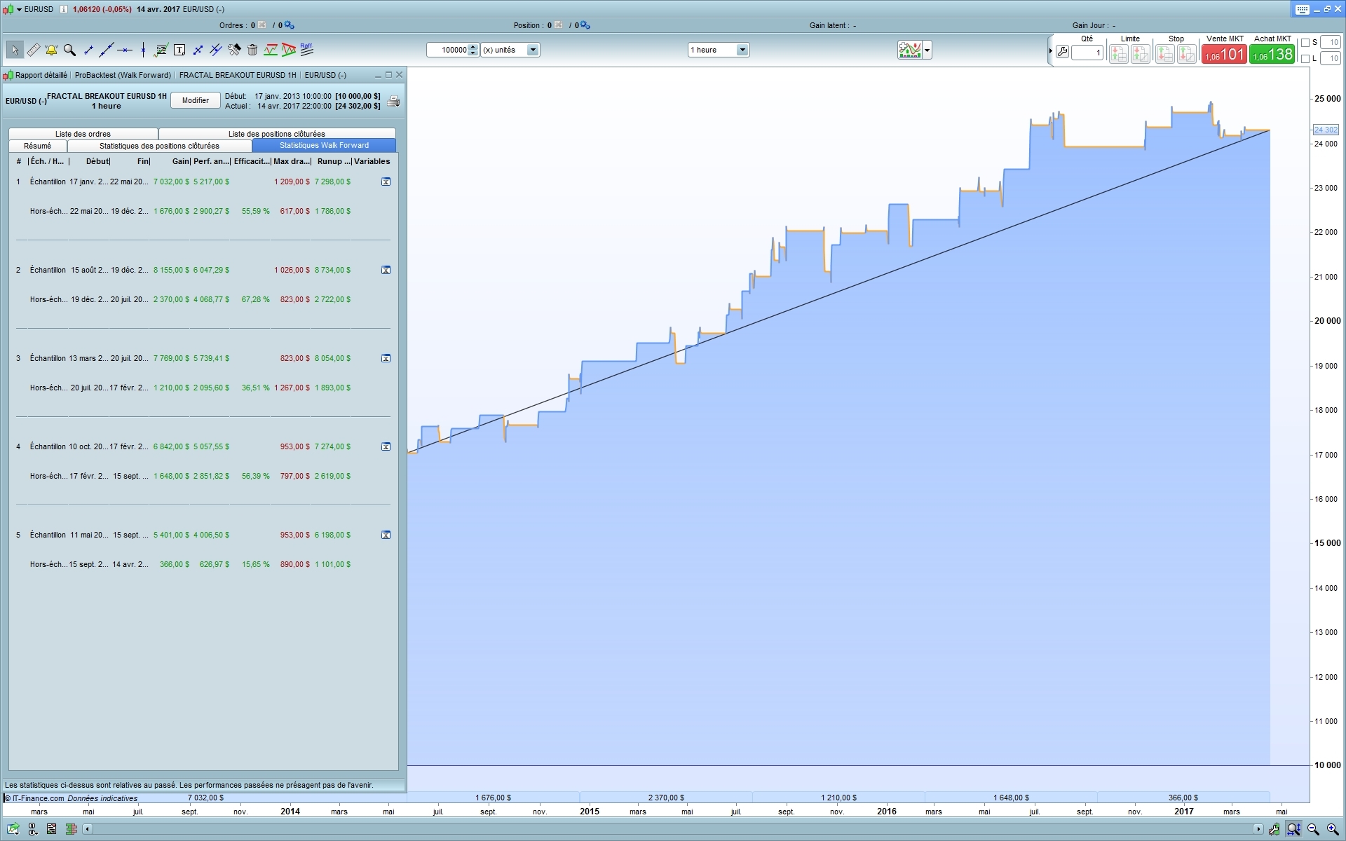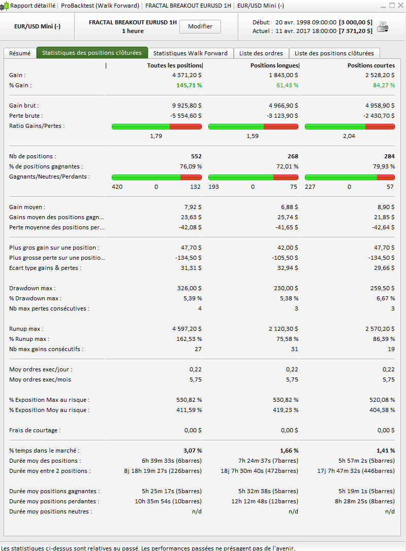 This is the MFE trailing stop, exit levels are only update once per bar at each calculation. Please find attached the pictures of my own WF test with the first version of the strategy (200.000 bars, ticks mode, 1 point spread) over 10 Out Of Sample iterations. I think that to suit the strategy for over forex pairs, the best solution would be to enlarge the fractals period (‘cp’ variable) minimum and maximum for the optimisation. That would adapt the high/low fractals for each pair behaviour. Since WF optimisation take ages, I encourage anyone willing to help to test if this rough idea could be relevant and to continue explore other possibilities of improvements. Thanks.