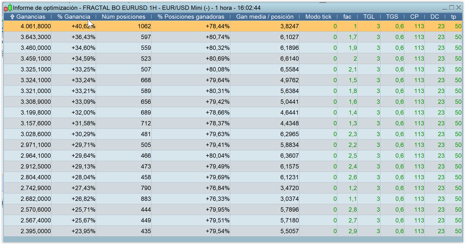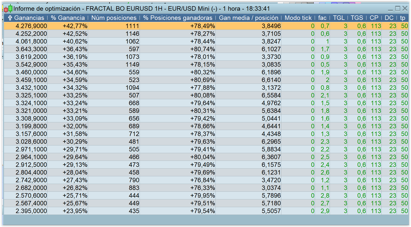 TGL, TGS, CP, DC and tp were not optimized, because if I do it with 100.000 bars, I will have to wait one week to see the final results. But probably with different values of these parameters, the results could be also better.