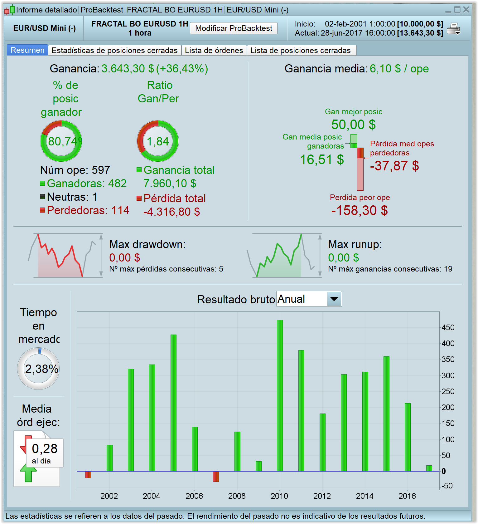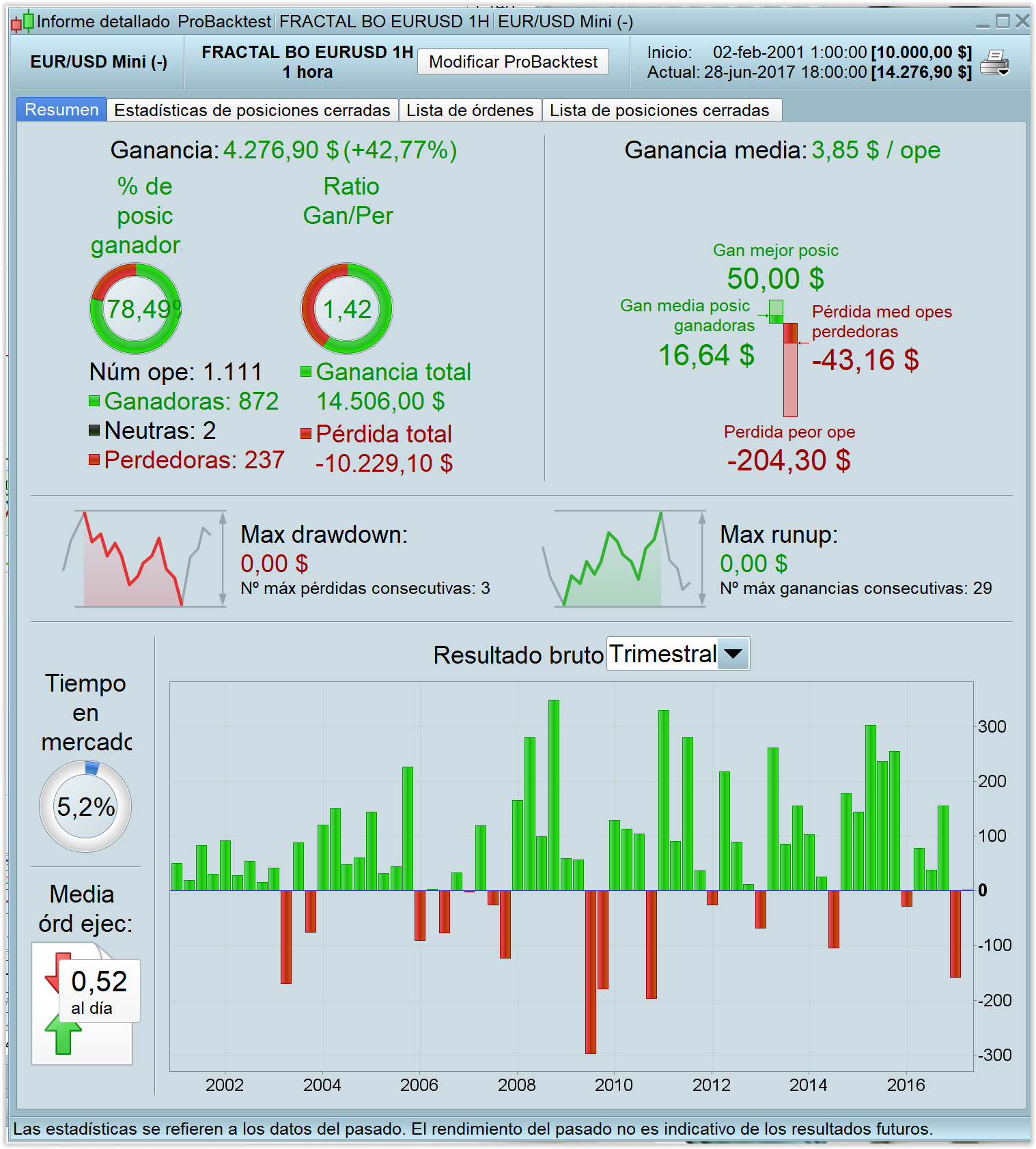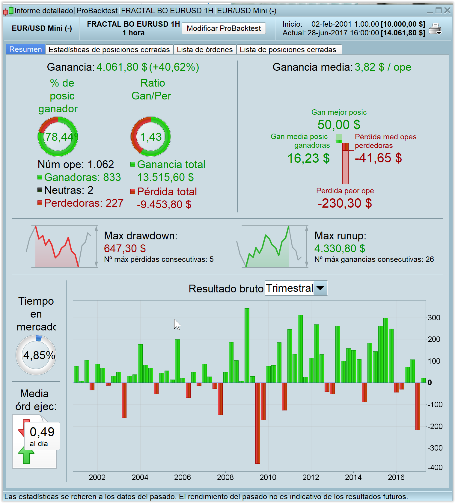 Best result is with factor 1, but I like more the second position (factor 1,7), with less total gains but better PF, curve and %Win.