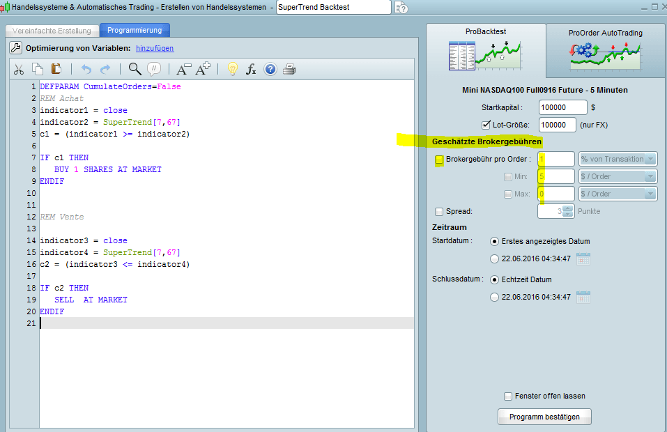 Du kannst die Fees einstellen, indem du beim Backtest auf ‘verändern’ klickst. Danach hast du die Möglichkeiten, die Broker Fees je nach den Modalitäten deines Brokers einzugeben: