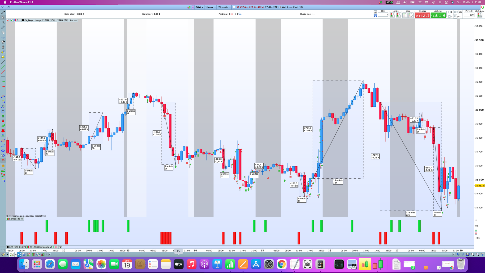 To be clear, I’m not suggesting to change all the parameters on a weekly basis. I came to notice that my entry points are OK (see attached Dow 1 hour). What’s failing me is the Exit tactics within the strategy. Sometime, Exit when Close crosses EMA21 works well, the next day is when Close crosses the Pivot Point or S1, S2, R1, R2, others is when EMA[X1,Y1] crosses over (or under) EMA[X2,Y2], Kijun crosses Tenkan, Fibo levels, etc.