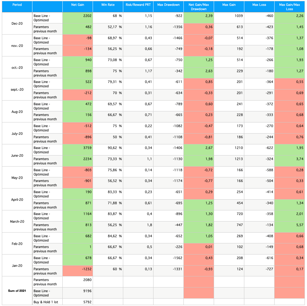 The result is a bit surprising. The optimal base line parameters determined on the period April 2019 to Dec. 2020 kept for each month of 2021 generated 9.196€ of Net Profit, while the parameters optimized on a monthly basis generated 2.080€ of Net Profit, a factor of 4x.