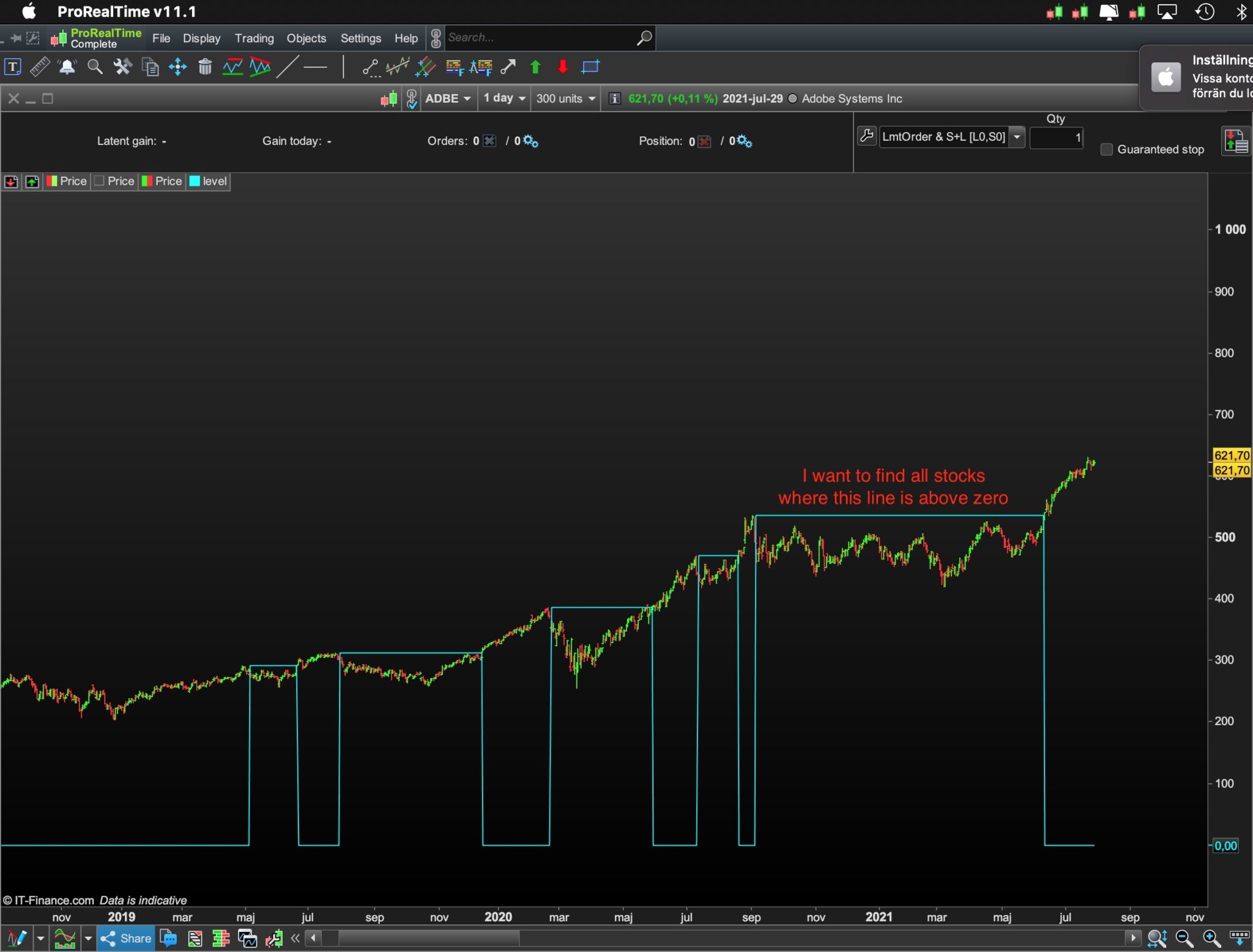 Anyway, I guess something is off with how I coded this indicator because I am not able to get pro screener to find all the stocks where this line is plotted. It finds a few of them – but it misses the majority. I would be very grateful if someone could take a look and see what could be wrong that causes the screener to miss so many stocks…