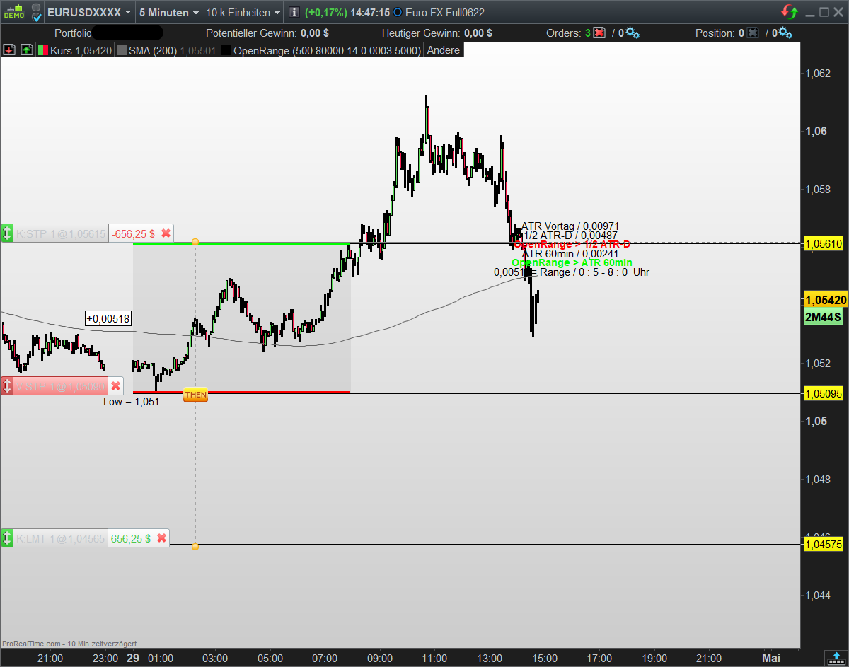 Die bedingung ob gehandelt wird oder nicht wären dann das die Range nicht größer sein darf als die halbe Tages ATR und nicht kleiner als die 60min ATR.