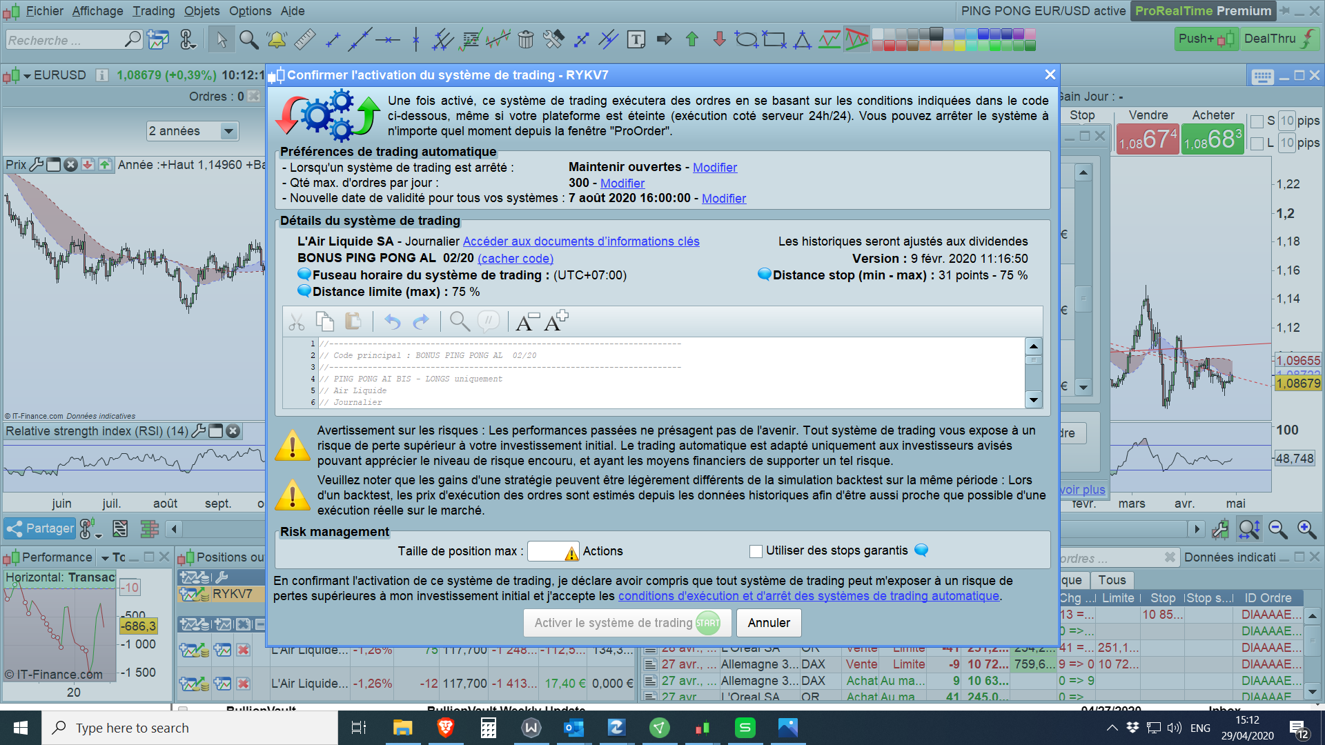 Je m'excuse d'avoir utilisé le français sur ce forum anglais. Comme on dit: "Pardonnez mon français" Concernant le sujet je pense avoir obtenu la réponse. Il faut d'abord définir le fuseau horaire de la plateforme (options), puis créer la stratégie de pro-commande. Lorsque nous l'activons, il fonctionnera alors avec le fuseau horaire de la plate-forme. Mais si par la suite vous changez le fuseau horaire de la plate-forme, les stratégies de commande en cours d'exécution ne seront pas mises à jour … elles fonctionneront toujours avec le fuseau horaire à leur date de création. Vous devez arrêter les stratégies de commande préalable et les recréer pour les faire fonctionner sur le nouveau fuseau horaire. Faites-moi savoir si vous avez la même compréhension.