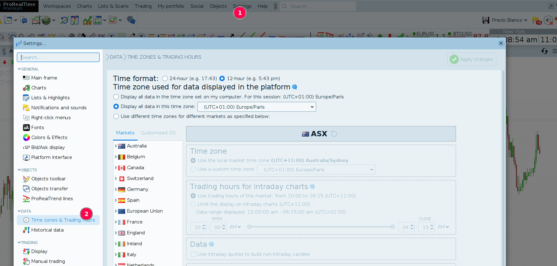 Buongiorno…come posso settare gli orari di trading in modo che i grafici siano allineati al fuso di Roma dalle 00:01 alle 00:00 sia per intraday che daily?…grazie—p.s. ho provato da personalizza orari di trading ma non cambia nulla al riavvio della piattaforma