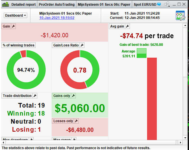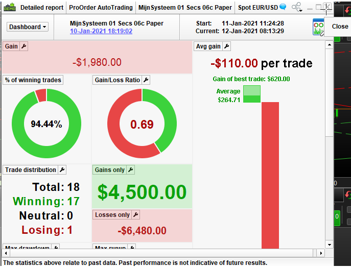 yeah, i think he means that you have to relaunch to see the total gain for that strategy. I’ve noticed the same thing. Performance only gets updated after a relaunch. Sometimes it keeps showing a latent gain after the position has closed, and sometimes it leaves out some transactions altogether. I have one in demo now that shows 100% win, even though the chart registers at least one loss, and total gain is not the same as the sum of the closed positions list.