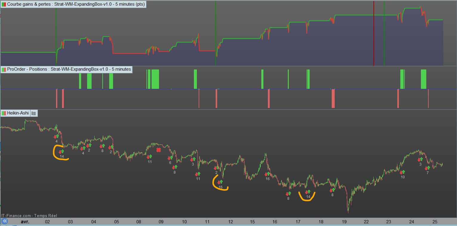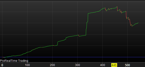The third picture shows this. This one started at April 1 (no joke) and it performed relatively very well. How ? because it explicitly makes use of what you see happening in the 4th picture. Think Long only but Enter lower than the previous Exit. This is not easy to accomplish and this is a first one where I could apply this.