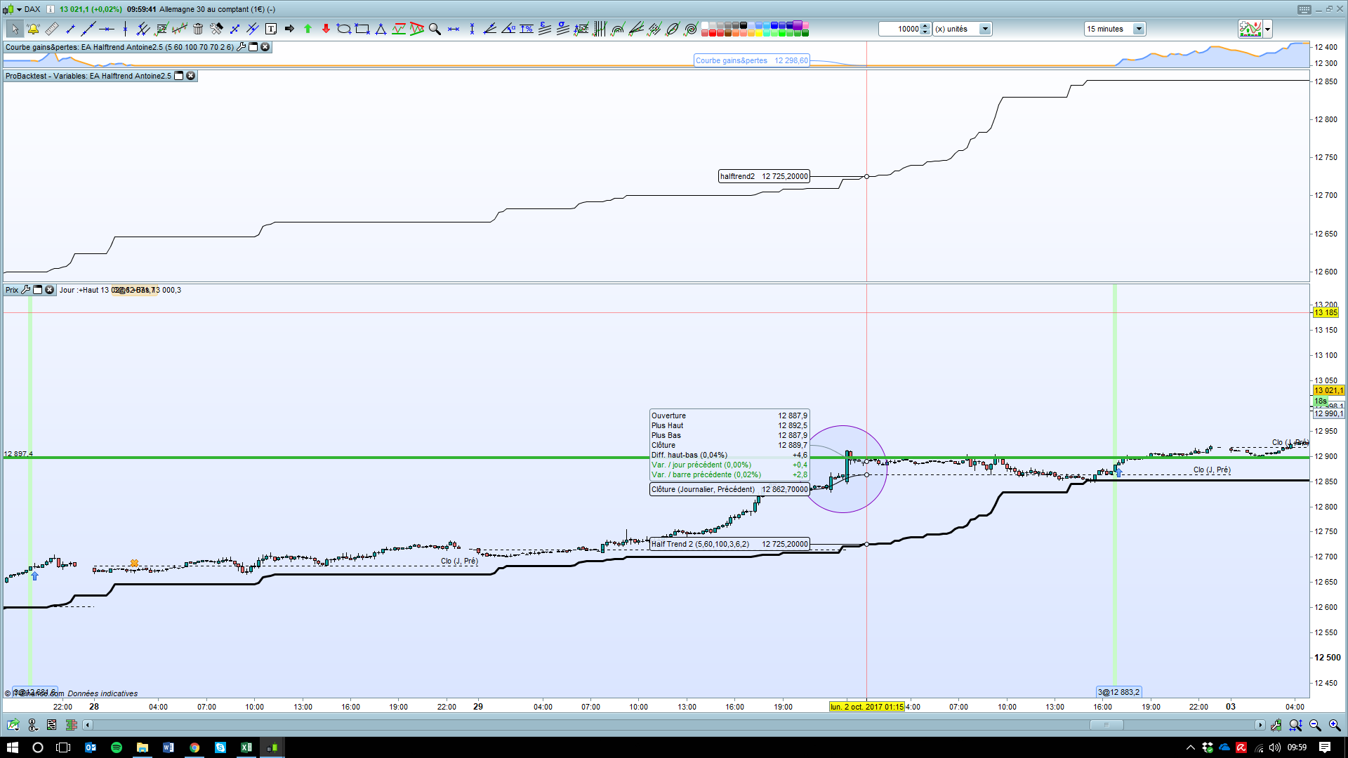 Une fois les données activée pour le weekend je n’ai plus de Gap entre le vendredi soir et le lundi matin, j’ai maintenant une bougie. Dans le Backtest elle devait bien être prise en compte, mais pas dans l’indicateur qui considérait un gap.