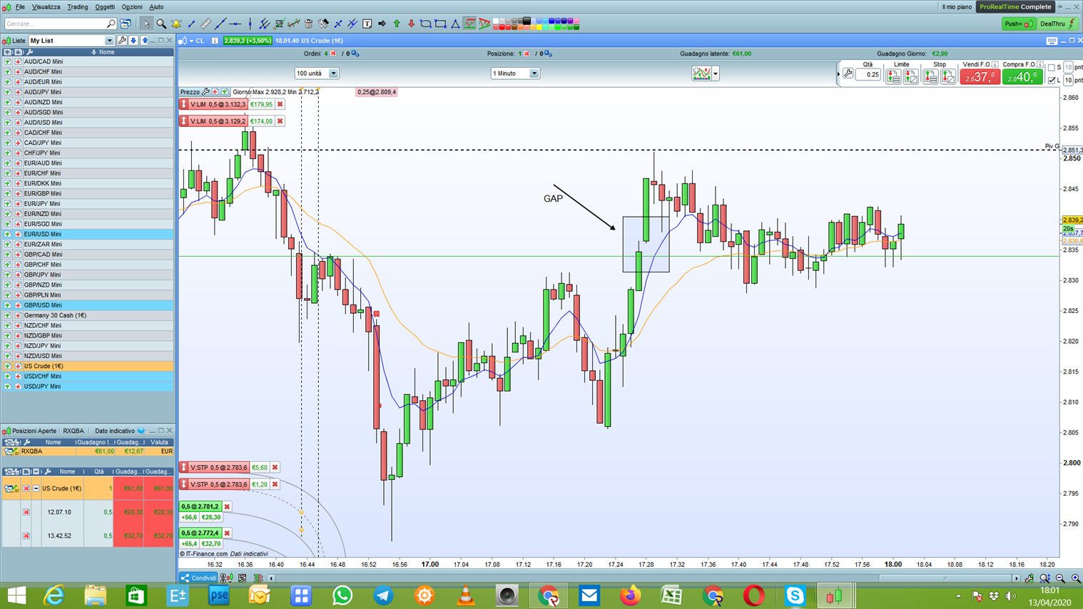 Buongiorno a tutti , ho cercato un indicatore per i Gap ( Buchi ) tra candela e candela , e ho importato Gap-Screener , che però non solo non lo vedo avviarsi , ma mi blocca la piattaforma PRT , e devo Ctr + Alt + Canc , fermare Java e far ripartire . C’è anche dell’altro . . . Con un indicatore Hikkake volevo far dare degli avvisi ( che poi gentilmenteRoberto mi ha scritto che non si può ) dalla finestra di ProScreener , e però intanto da quel punto , ogni volta che cerco di importare dei itf mi vanno in ProScreener direttamente e non riesco più ad averli sul grafico .