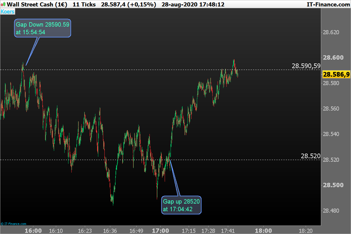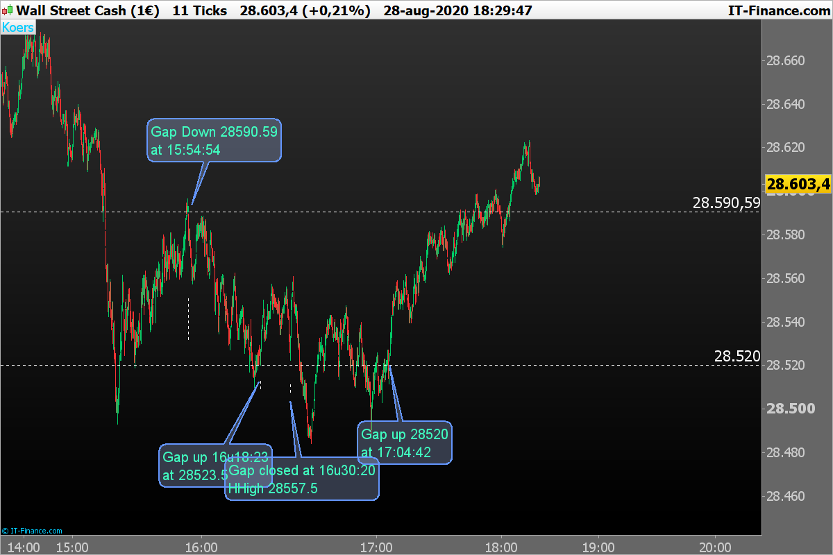 Today I have used a 11 tics graph on the DJ, to evaluate one of my own indicators. Instead of evaluating the Indicator I saw a gap(down) at 15u54:54 (price 28590.59). At about 16u00, there were several tries to close the gap, but gapclosing failed.