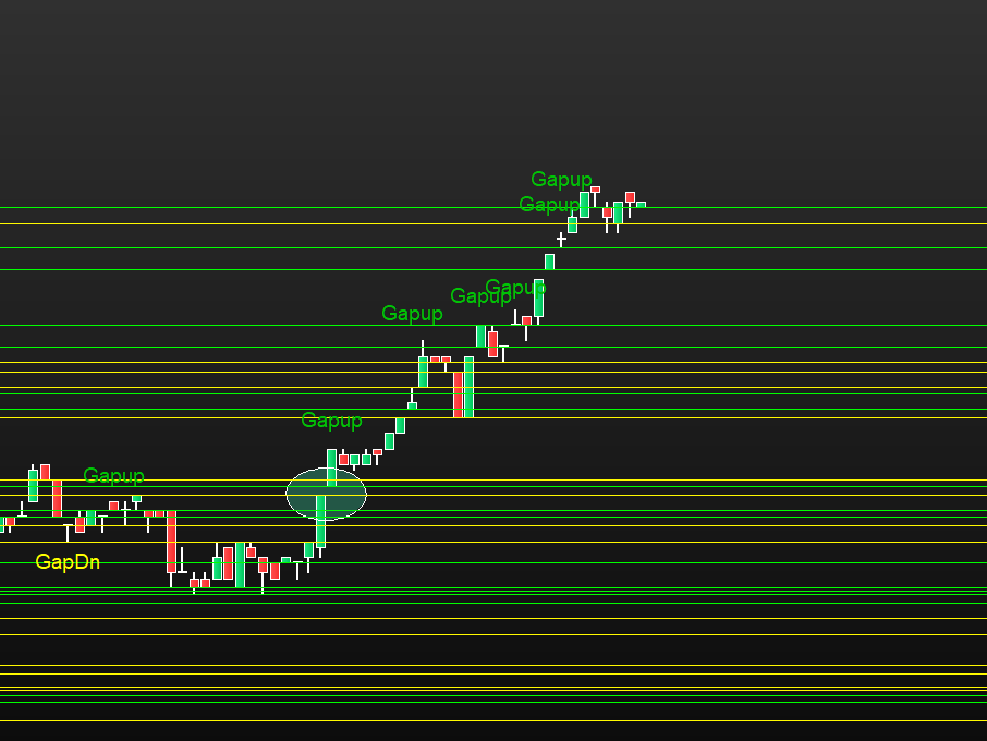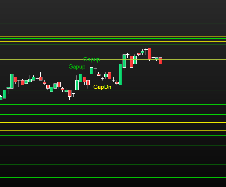 I have wrote a code for “GapSerching” see at my topics and maybe later in the library. So far so good. In the attachement you can see an example of a gapup (green text and green lines) and a gapdn(yellow text and lines).