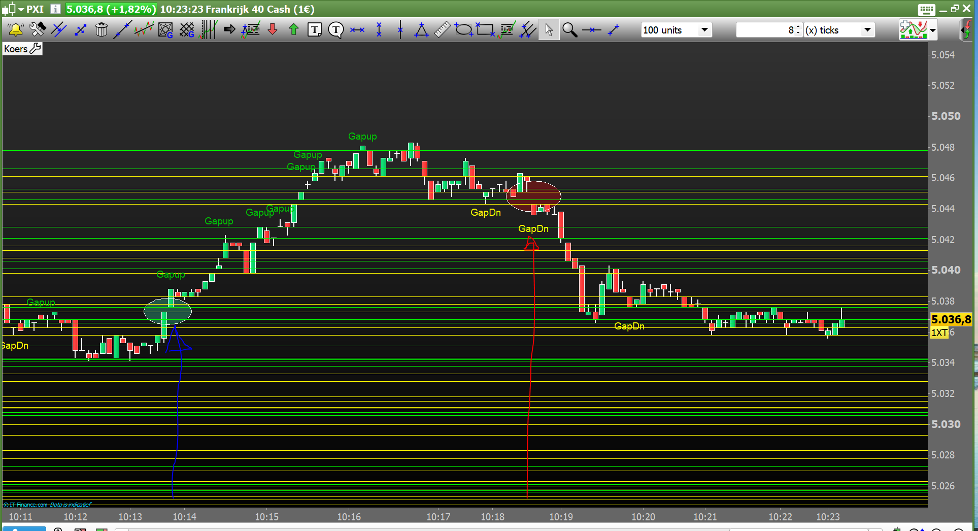 There are several gaps up, but closed whitin a few candles, except the one in the green cirkel is open. The gap, close about 6 minutes later as you can see in the attachements.
