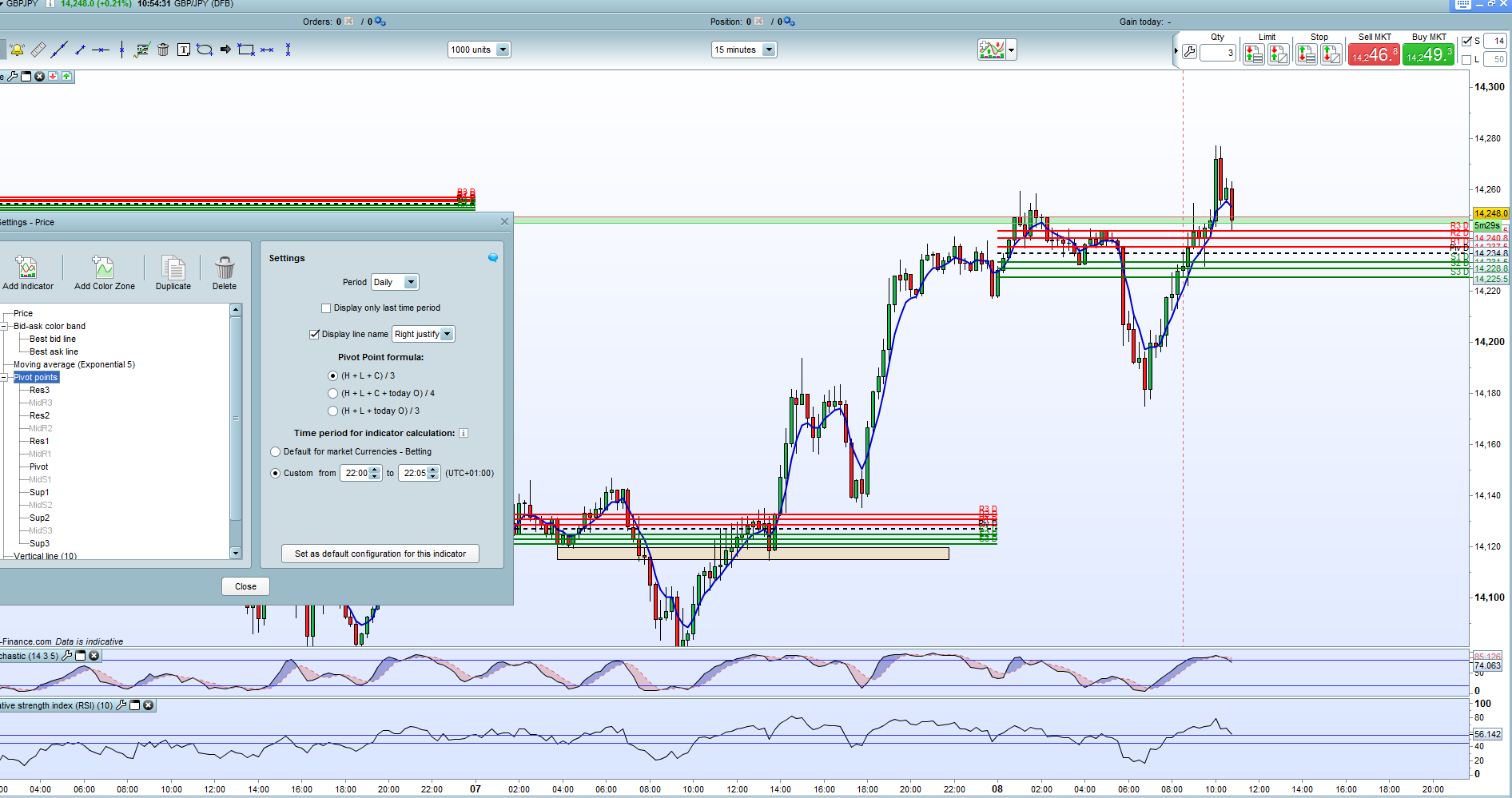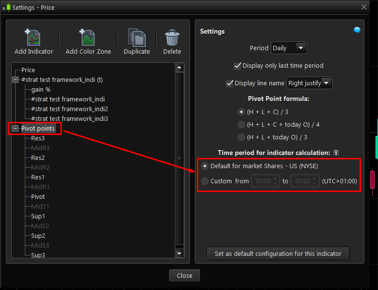 The pivot points lines are narrowed because you only take price values between 22:00 and 22:05 from the previous day (only 5 minutes). You should change the time zone to a custom one instead and then use the default pivot points hours.