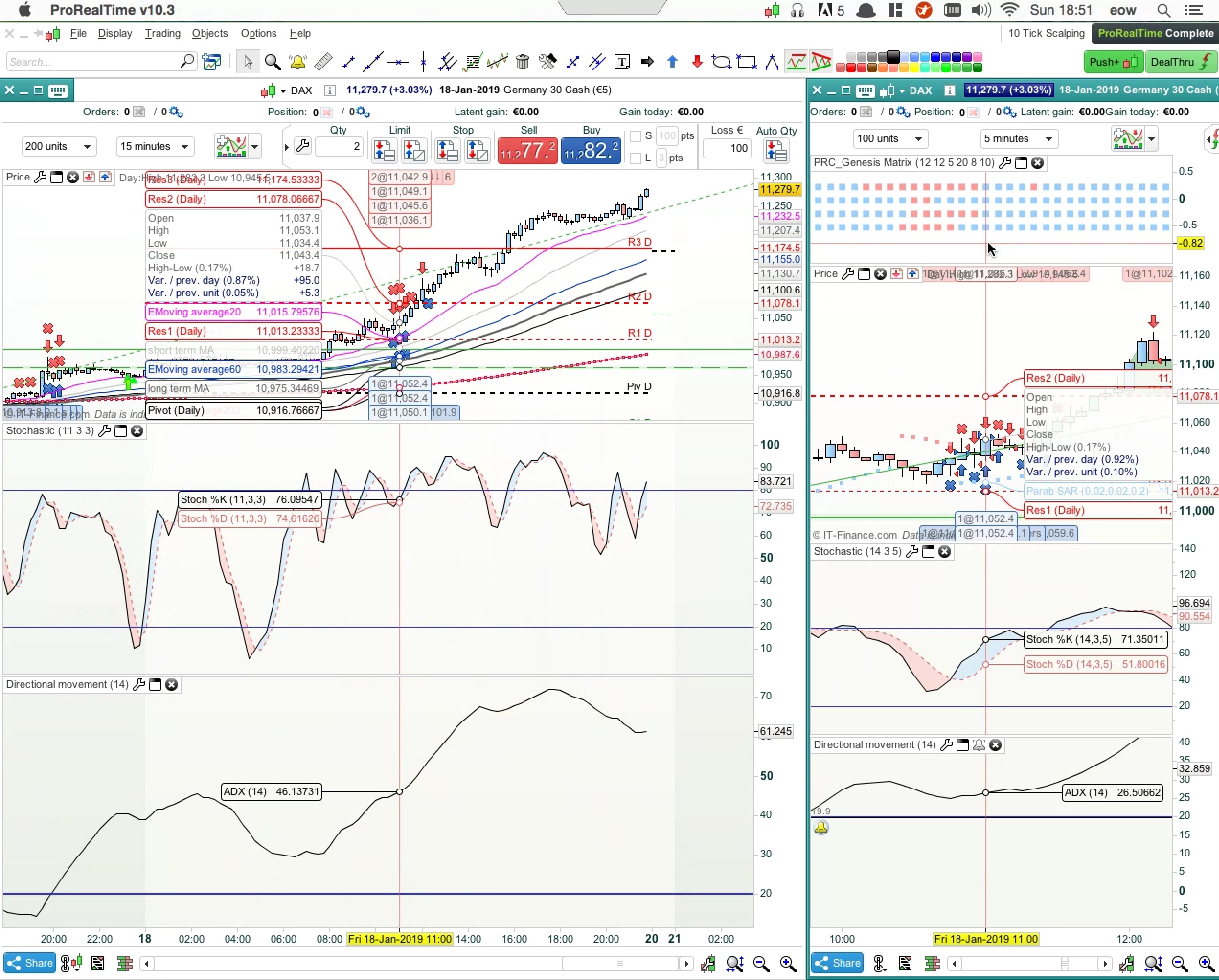 – Stochastic [11, 3, 3] 5min moving up on a buy (blue) signal and down on a sell (red) signal