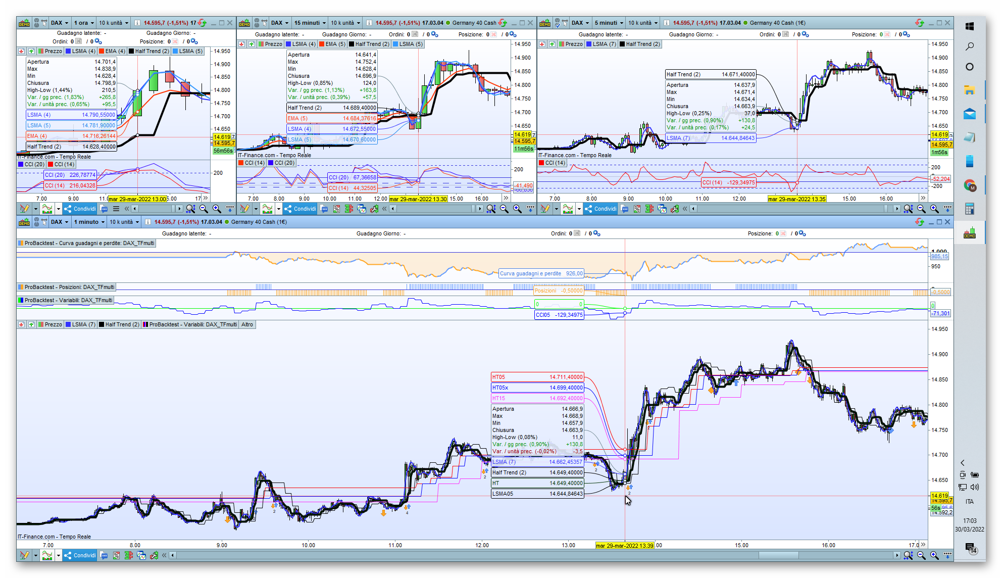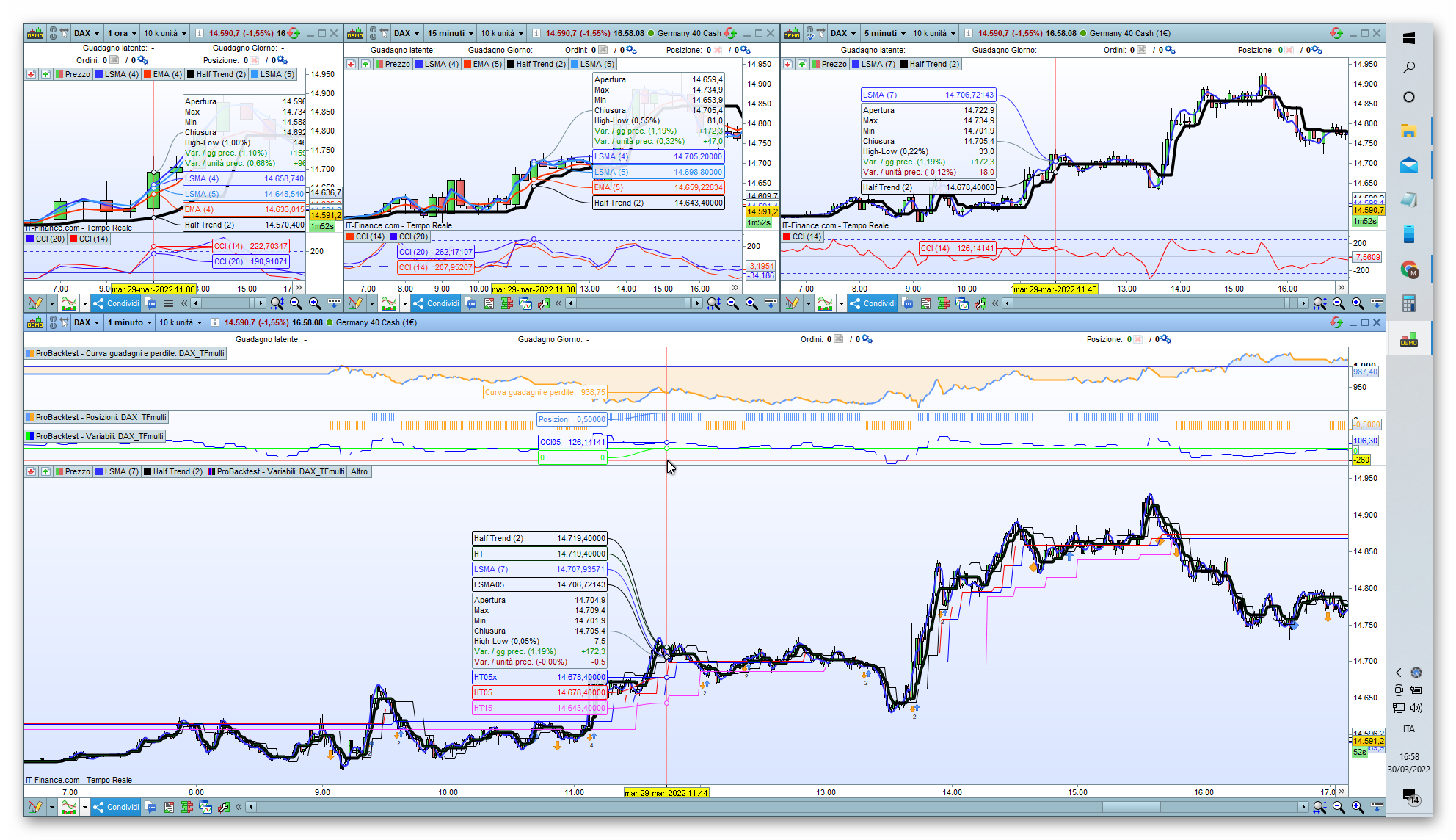 Sto provando a gestire una strategia su più TIMEFRAME e per carcare di capire come si comporta ho visualizzato in grafico i dati ottenuti ma non capisco perchè i risultati di una CALL in certi momenti siano come bloccati e fissi mentre in altri sono corretti. Ho allegato il programma (DAX_TFmulti) che sto testando e il programma dell’indicatore chiamato (HalfTrend) nonchè due screenshot dove si vede chiaramente che in quello chiamato “DAX_TFmulti ok” i dati calcolati nei vari timeframe coincidono mentre nell’altro screenshot sono completamente diversi e rimangono diversi per periodi di tempo diversi a volte anche per ore ??