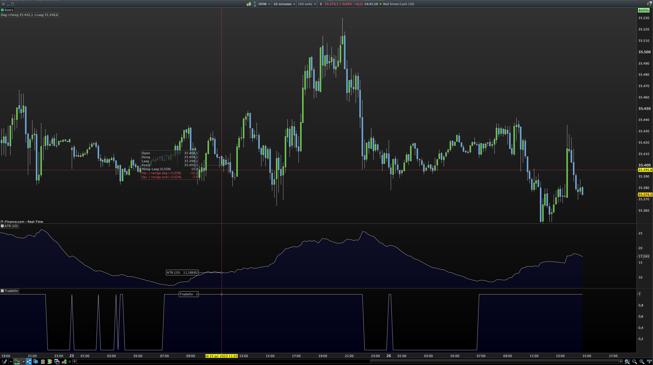 Do you have any code that will stop the indicator from looking at the late night time frames where there are very little inputs, this is on an index so at night from about 10 PM till 7PM there is almost no volume. I am trying to use a few average true range lines and measuring the distance between the lines, they get very close in Sidways or night moves.. I may be over complicating this a bit. So the idea is to not stop looking for the bigger moves that sometimes happen at night and rather get into the move slightly later but looking first at the average distance between the true range lines and then the distance that is seen now, if its above or below by a certain percentage the trade signal will be allowed.