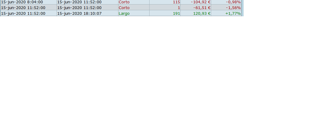 - Exit order of 0.58: Here is when the plataform get mess up with the orders because it puts this new entry order as exit order instead the actual exit order of 0.92. And this -0.92/0.58 operation corresponds to the first closed order in the list for -104.92€