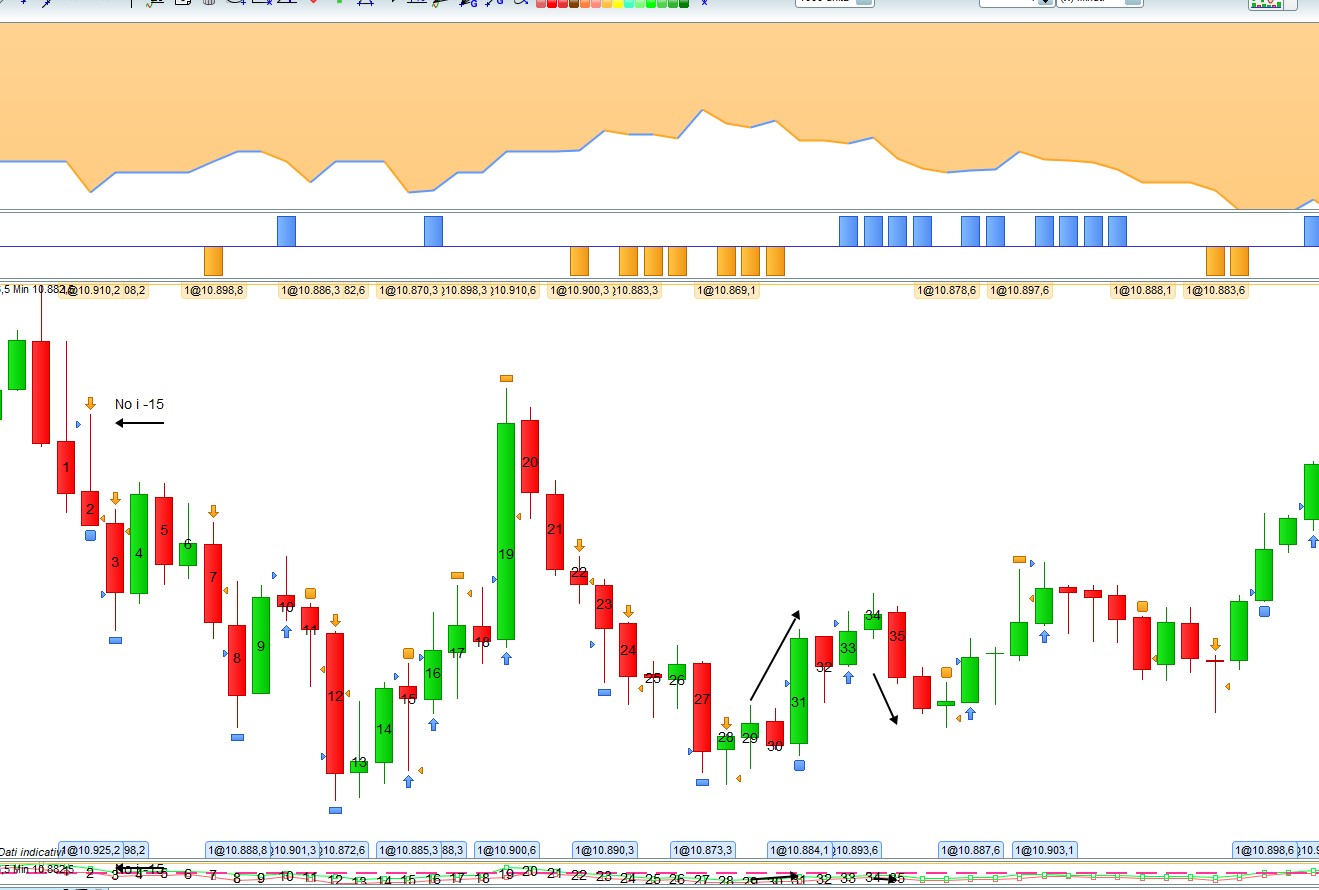 partenza dalla candela 1 , la 2 prima penso che vada su e poi apre lo short dopo che scende , quindi 1 pip più basso inizia la freccia nera che completa il TP con la 3 . Chiusa la posizione ci DEVE essere l’attesa della chiusura della candela 3 prima di procedere ad una nuova lettura del ciclo , parte la 4 = inizio lettura del ciclo : chi supera le due highs/lows precedenti ? La 4 no , la 5 no , la 6 no , è la 7 che supera e ottiene il TP dei 10 = freccia nera . Quindi alla candela 8 io ho un +20 punti di TP . Poi la 9 niente , la 10 si , supera , apre il long ma gira storto , addirittura candela 9 precedente lunga mi chiude lo SL = freccia rossa -15 . Attesa della chiusura ( come per tutte le candele tutte le volte ) della candela 11 riparte il ciclo : chi supera le due highs/lows precedenti ? = la 12 , che mi produce un +10 come da freccia nera . Attesa chiusura freccia 12 , quindi riparte il ciclo : chi supera le due highs/lows precedenti ? = la 15 che prima sale e apre il long ma gira contro e oltretutto mi prende lo SL . Sempre attesa chiusura 15 riparte il ciclo = è la 16 = long come da freccia nera = +10 con la 17 . La 18 niente , tocca la 19 che mi da un +10 = freccia nera . Attesa della chiusura della 19 riparte il ciclo , 20 no , 21 no , è la 22 che apre e con la 23 ottengo i +10 = freccia nera . Attendo chiusura 23 e riparte il ciclo , 24 si short e ok fino alla 27 che mi produce +10 di TP . Attendo chiusura 27 e la 28 mi riapre lo short ma gira contro e mi si chiude a -12 della 29 perché ? Perché la 29 ad 1 pip sopra parte il long creato dalla 31 che mi raggiunge i +10 freccia nera . Attesa delle chiusure e letture ciclo , tocca alla 33 che apre il long , 34 , 35 gira contro e mi fa chiudere a -5.8 che sono 1 pip sotto della 33 da cui parte lo short che mi apre la 35 . 36 e 37 niente , lo short si chiude per via della 38 che mi fa prima chiudere lo short con -0.3 e mi apre il long che con la 40 mi produce +10 freccia nera .