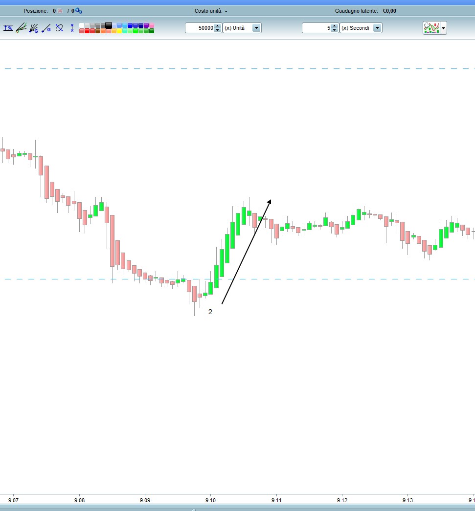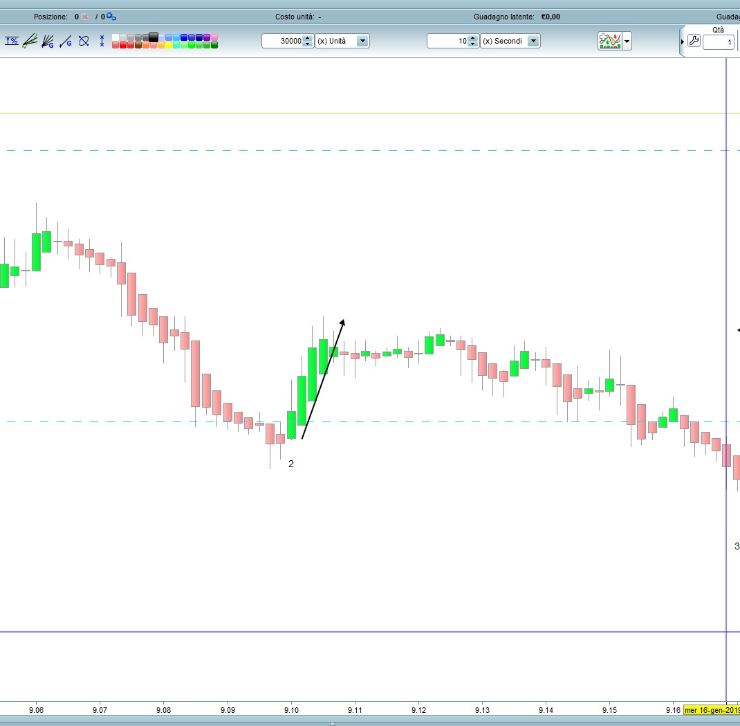 foto allegata Gian7G : ecco abbiamo un problema di partenza che deve prevalere il cambio di trend , ossia deve prevalere l’inversione prima dei 15 di stop loss , e ti spiego : dalla foto 7G abbiamo che già alla candela 2 non devo avere lo stop dei -15 perché non ha ancora aperto la posizione . Se guardi la foto 7H dove finisce la 1 ed inizia la 2 abbiamo che in realtà prima va su e mi forma l’high e poi scende attivandomi in quel momento l’apertura della posizione short . Quindi il -15 non devo averlo . E ci sono altri casi più avanti che ti faccio vedere . Quindi il mio pensiero era quello di impostare un ciclo di analisi/lettura di base tutte le volte che si chiude una candela ed inizia un’altra , ossia si chiude una candela , ecco , chi in questo momento sta passando di 1 pip il max/min delle due highs/lows precedenti ? se ho già una posizione aperta proseguo , ma cambio alla prima inversione , ma nel caso di candele lunghe dove l’inversione è più profonda ecco che metto uno stop loss di 15 nel caso giri contro . Come hai fatto ci siamo quasi . Andiamo avanti : allora arrivati alla candela 2 che priima va su di quello che vuole , mi fa l’apertura della posizione dopo che è salita e scende . 3 4 5 6 ok , 7 ok , 10 ok , 11 ok ed è corretto che mi becca lo stop loss dei 15 proprio perché la 10 mi ha aperto prima il long ( prima la candela rossa va su e poi scende ) poi siccome mi va contro e gira in short quando si chiude la 10 e la 11 scende , dato che le due precedenti ossia la 9 e la 10 hanno i loro lows molto bassi , prima che la 12 apra lo schort mi superano i 15 punti di stop loss , ed è giusto che intervenga , quindi ok la 11 ed anche la 12 . La candela 15 anche lei è ok , perché apre il long giusto poi scende tanto e mi prende lo stop loss . Arriviamo fino alla candela 27 , chiude la candela ed anche il profit , la 28 giustamente apre lo short ( prima scende e poi sale ) ma alla partenza della candela 31 mi “dovrebbe” chiudere lo short ed aprire il long da dove inizia la freccia nera , ossia riparte la lettura del ciclo chi sono i due nuovi max/min di high/low ? ed anche in questo caso non prende lo stop loss dei -15 ma pago dalla apertura della 28 alla apertura di 1 pip sopra la 29 , da cui inizia il long . Così anche la 33 , apre il long , ok , ma alla lettura del ciclo mi chiude il long ad un pip sotto il low della 33 , momento in cui la 35 mi apre lo short .