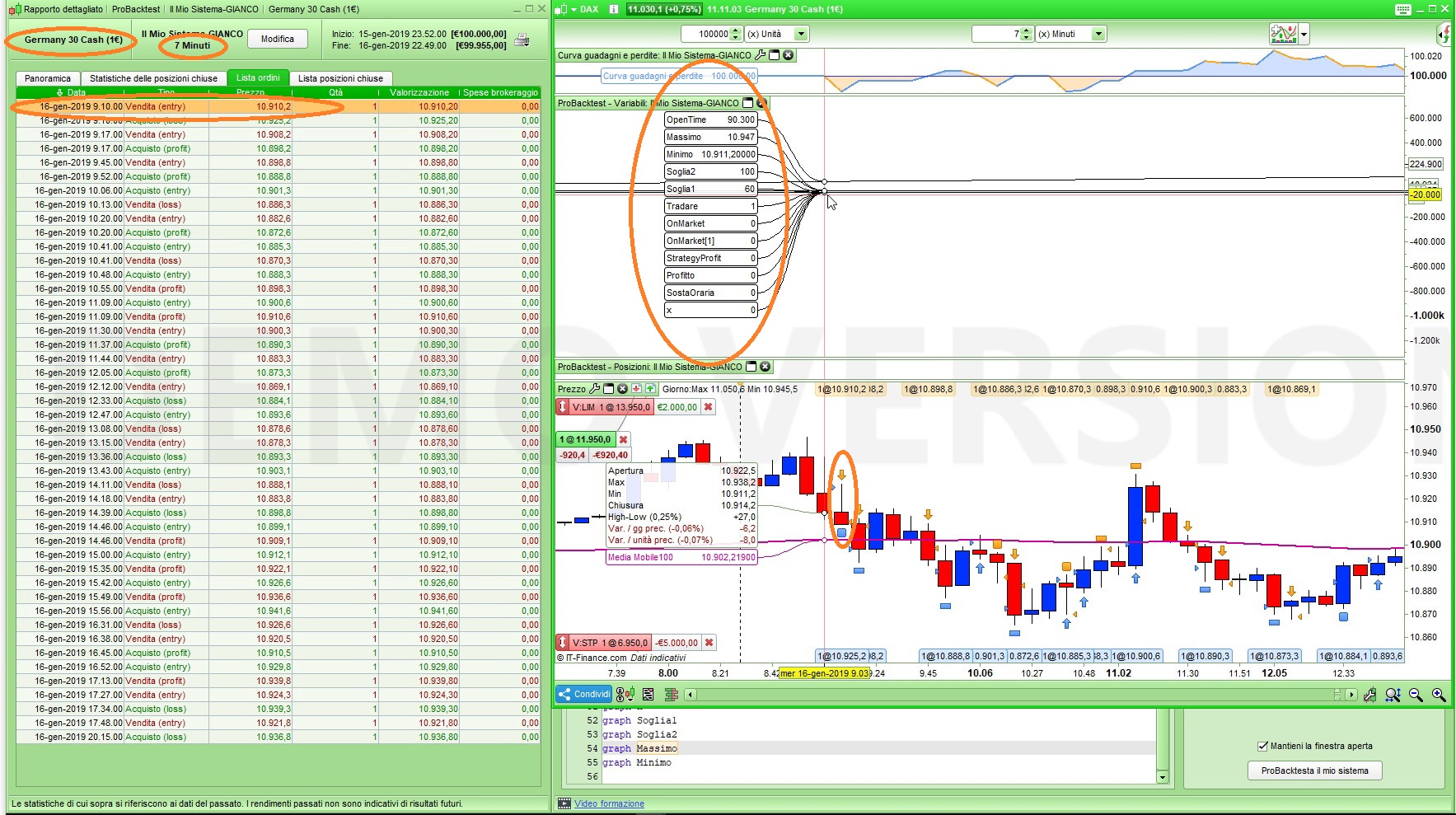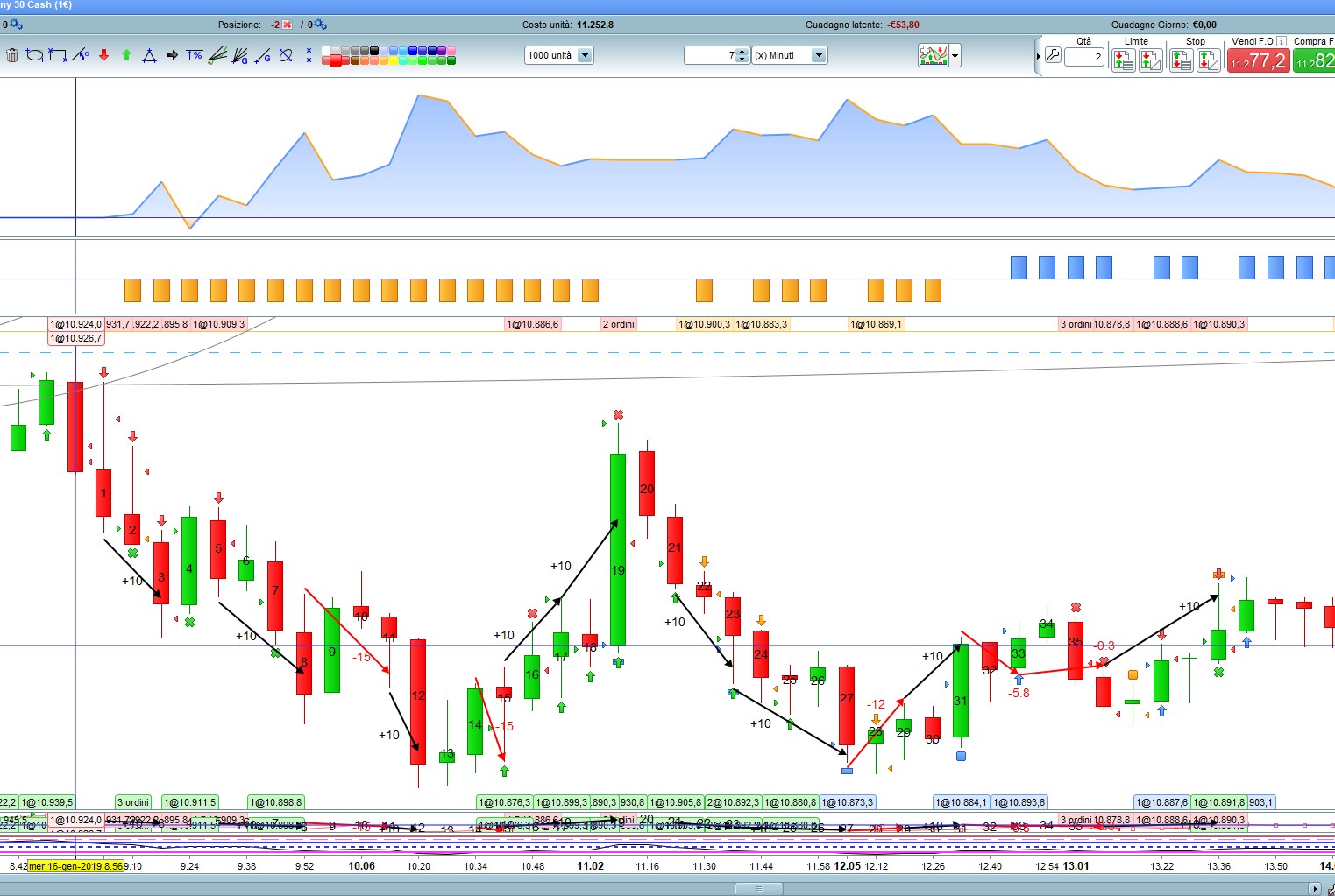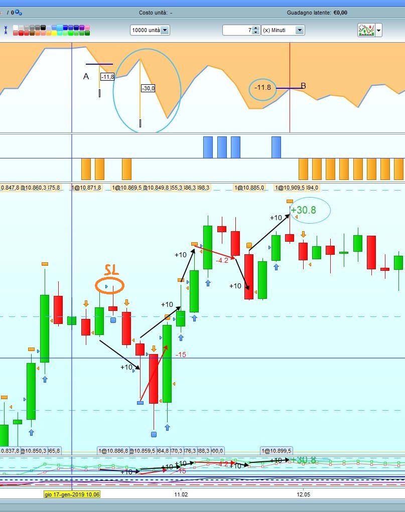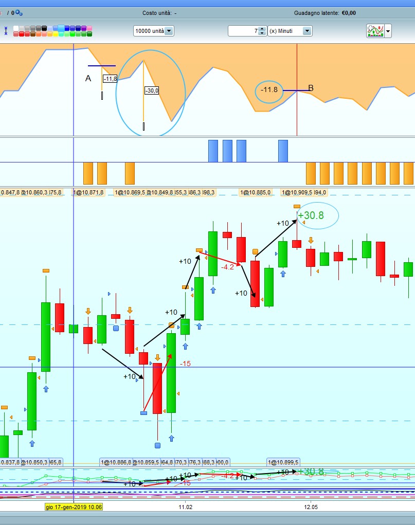 Ciao Roberto , ti allego anche in file Gian7P , un esempio del 17 gennaio , micro dax , 7 minuti , dove ho guardato come sarebbe il totale sul grafico sotto , ed invece cosa realizza la Curva Guadagni e Perdite sopra , ti ho tracciato le frecce nere che corrispondono al target +10 punti , dopo la prima freccia nera ho la prima freccia rossa da -15 di SL , però sopra me ne toglie -30 , in realtà dovrebbe essere -15 . Andando avanti abbiamo le altre 2 frecce nere da +10 cadauna , e poi una seconda freccia rossa da -4.2 , perchè sarebbe stata long ma ha girato contro e dato che partiva uno short come da verifica del ciclo alla scadenza dei 7 minuti (variabile in impostazione ) , che andando avanti oltre ad aver chiuso il contro long a -4.2 mi fa stop and reverce con lo short = +10 punti , e così +10 anche l’ultima freccia . Ecco in totale ho realizzato +30.8 punti , ma sopra nella Curva Guadagni e Perdite dal punto A al punto B mi da -11.8 ( circa , non guardiamo i decimali ) ed invece dovrei avere +30.8 . Da notare l’ellisse con il righello da -30 in realtà io ho la freccia rossa da -15 .
