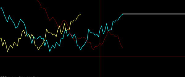 Abgebildet ist ein Ichimoku, zur Verdeutlichung sind nur sichtbar der Kurs (blau) und der Chikou (gelb, dieser entspricht genau dem Kurs, ist jedoch im Fenster um 26 Perioden nach links versetzt dargestellt). Also eine horizontale Verschiebung nach links.