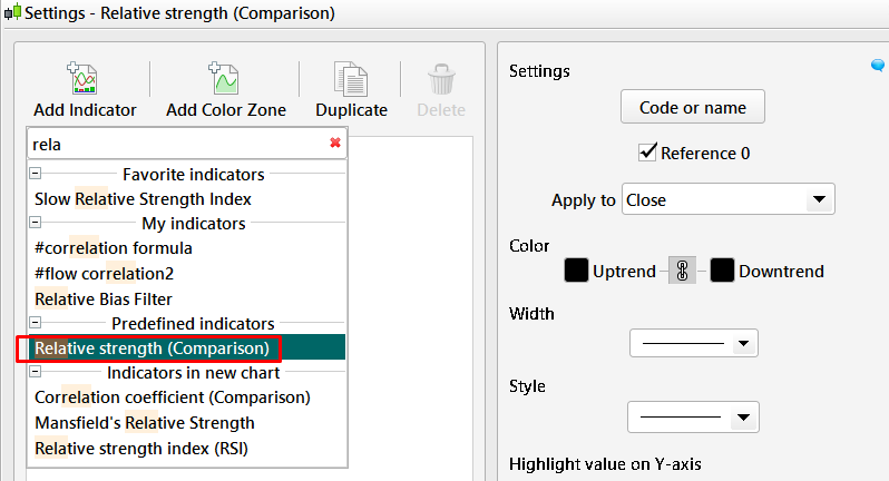 - Comparazione dell’indicatore di forza relativa (aggiungila come qualsiasi altro indicatore e scegli lo strumento da confrontare)