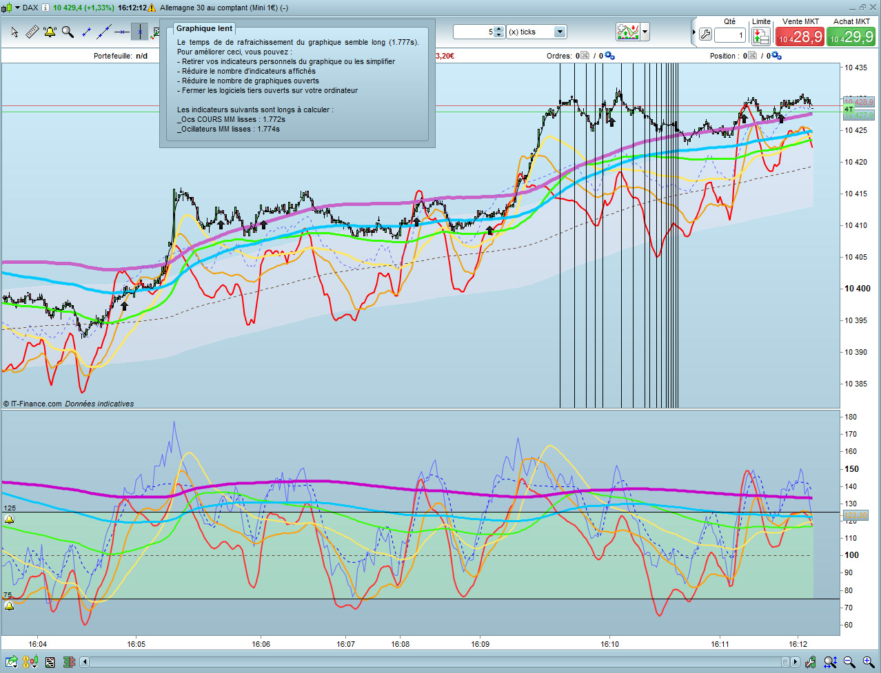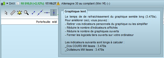 En “5 ticks” et lorsque le cours évolue rapidement, je vois souvent une petite fenêtre “Graphique Lent” m’avertir de ce que “Le temps de rafraichissement du graphique semble long” , par exemple 3.478 seconde … J’ai mis l’image en attaché. (remarquez dans le nom de la fenêtre, la petite icone “danger” style panneau triangulaire, code de la route)