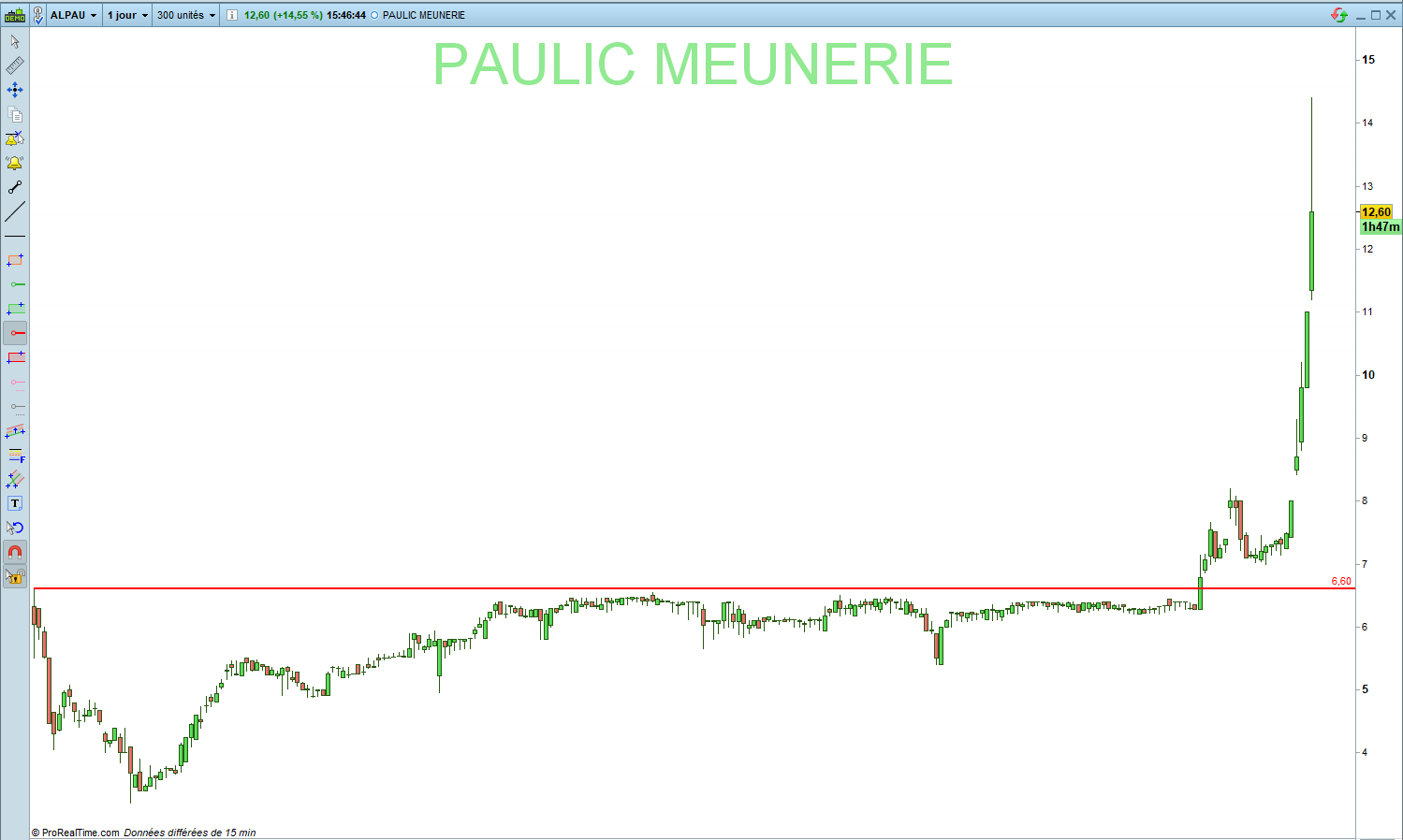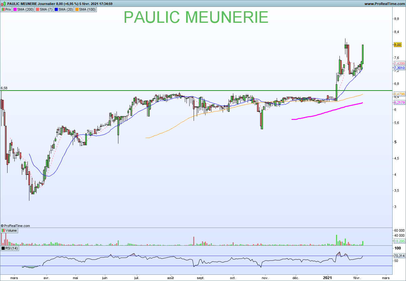 La PJ ci dessous est un très bel exemple de valeurs recherchées. Un cours d’intro (qui constitue pendant longtemps un plus haut historique), un niveau qui est ensuite retesté plusieurs fois (qui indique donc sa pertinence mais pas forcément évalué dans le screener), une cassure (ce qu’on cherche à screener), puis une belle envolée (ce qu’on espère tous :D)