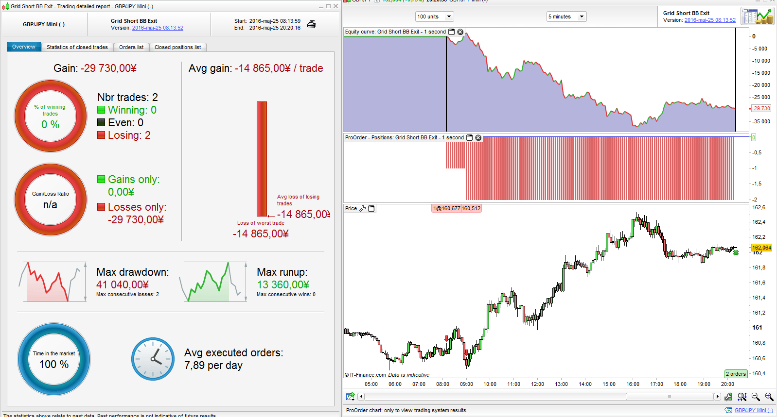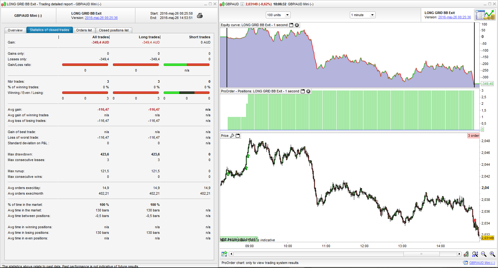 So another day of real time testing, as I mentioned in my post yeterday the BB exit is working great so far but the regular SL at 1 % does not seem to be working. The Nikkei trade I opened on Monday and wrote about was not closed at -2% neitherr was a GBPJPY trade which i took today setting the SL at -1 %, the floating loss reached about -2.3 % before I stopped the system manually. Please have a look guys to see what might be the problem…