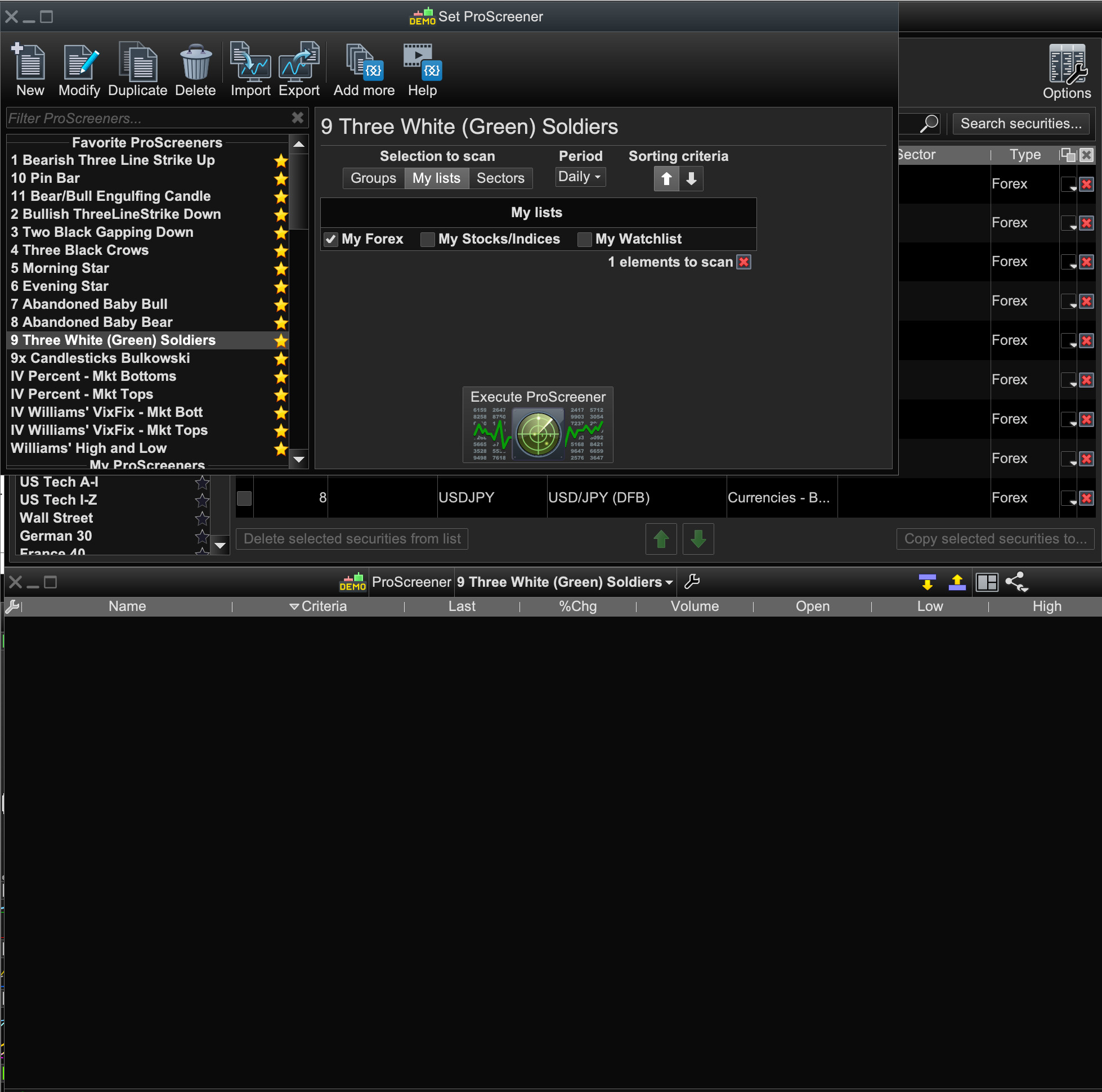 I did a daily Forex list scan of a candlestick pattern (three green candles) and it unusually produced no results (pls see also my post about the 9x Bulkowski candlestick pattern never finishing a scan above).