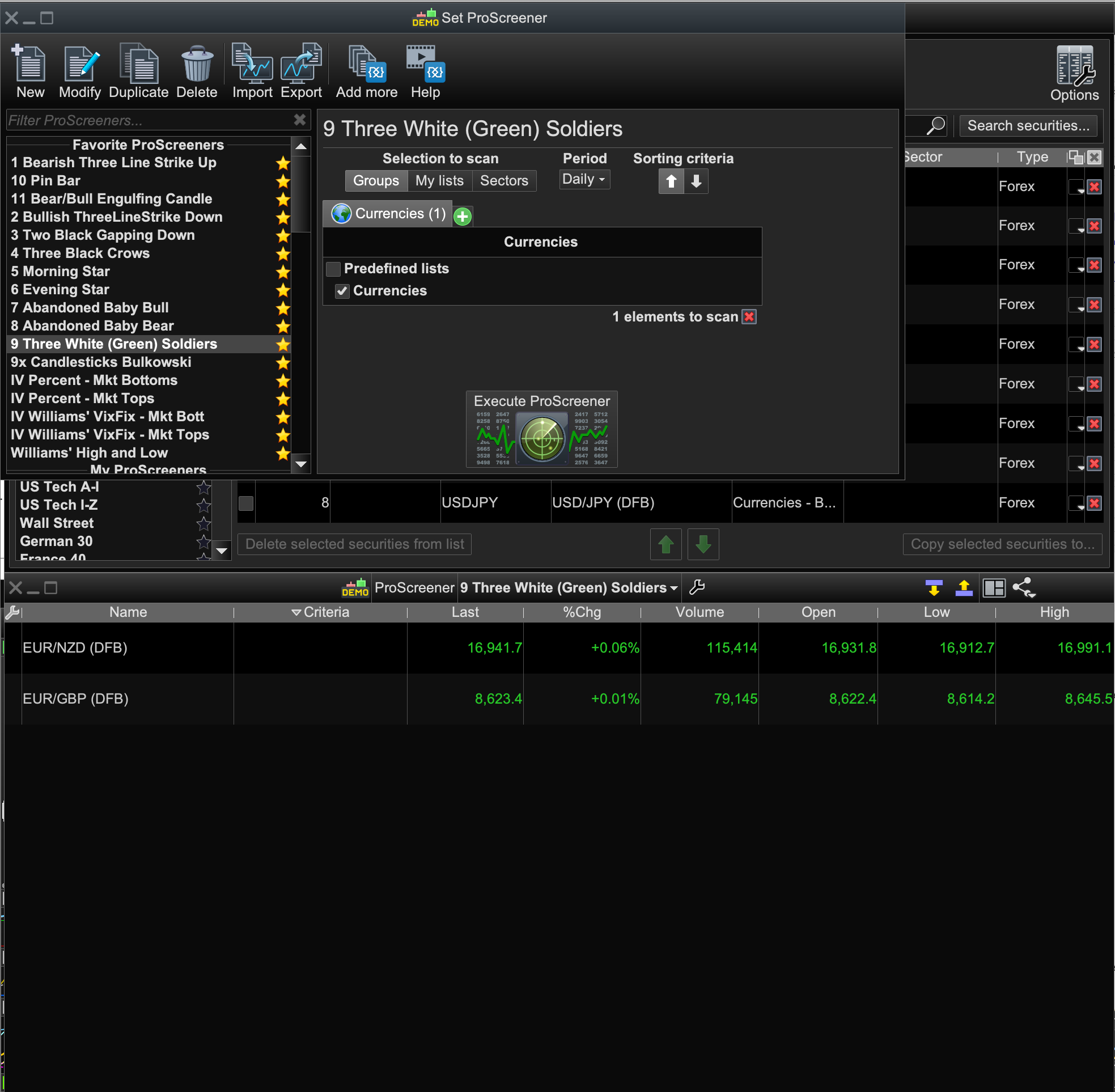 So I re-did the scan but using “currencies” from the Groups options and when I did this group scan of the same three green candles candlestick pattern, it produced the €/NZ and €/£ as results.