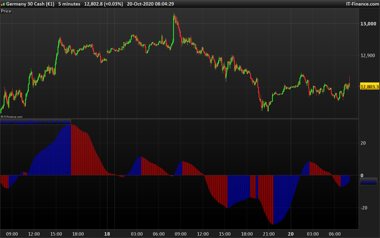 J’aimerai le compléter par deux informations : je souhaiterais quand les écarts > 0 (donc guppy CT > guppy LT) avoir la moyenne de ces écarts positifs sur (par exemple) les 50 dernières périodes et que cette moyenne soit matérialisé par une ligne qui changerait de couleur si la nouvelle moyenne calculée toutes les 15 minutes (si nous sommes en UT 15 minutes) : si la nouvelle moyenne calculée est supérieure à la précédente, alors la ligne est de couleur bleue, si la nouvelle moyenne calculée est inférieure à la précédente, la ligne serait rouge. Et l’inverse quand les écarts sont négatifs.