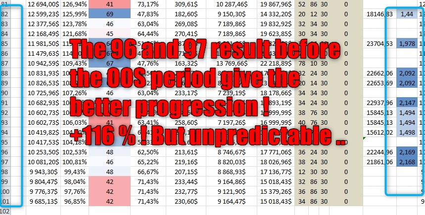 Same thing for the absolute variation. In this trial, the first results before the OOS (1 to 5 first results) win 5500 euros in 2 weeks versus 11 800 euros for the number 96 and 97 before OOS test (See picture)