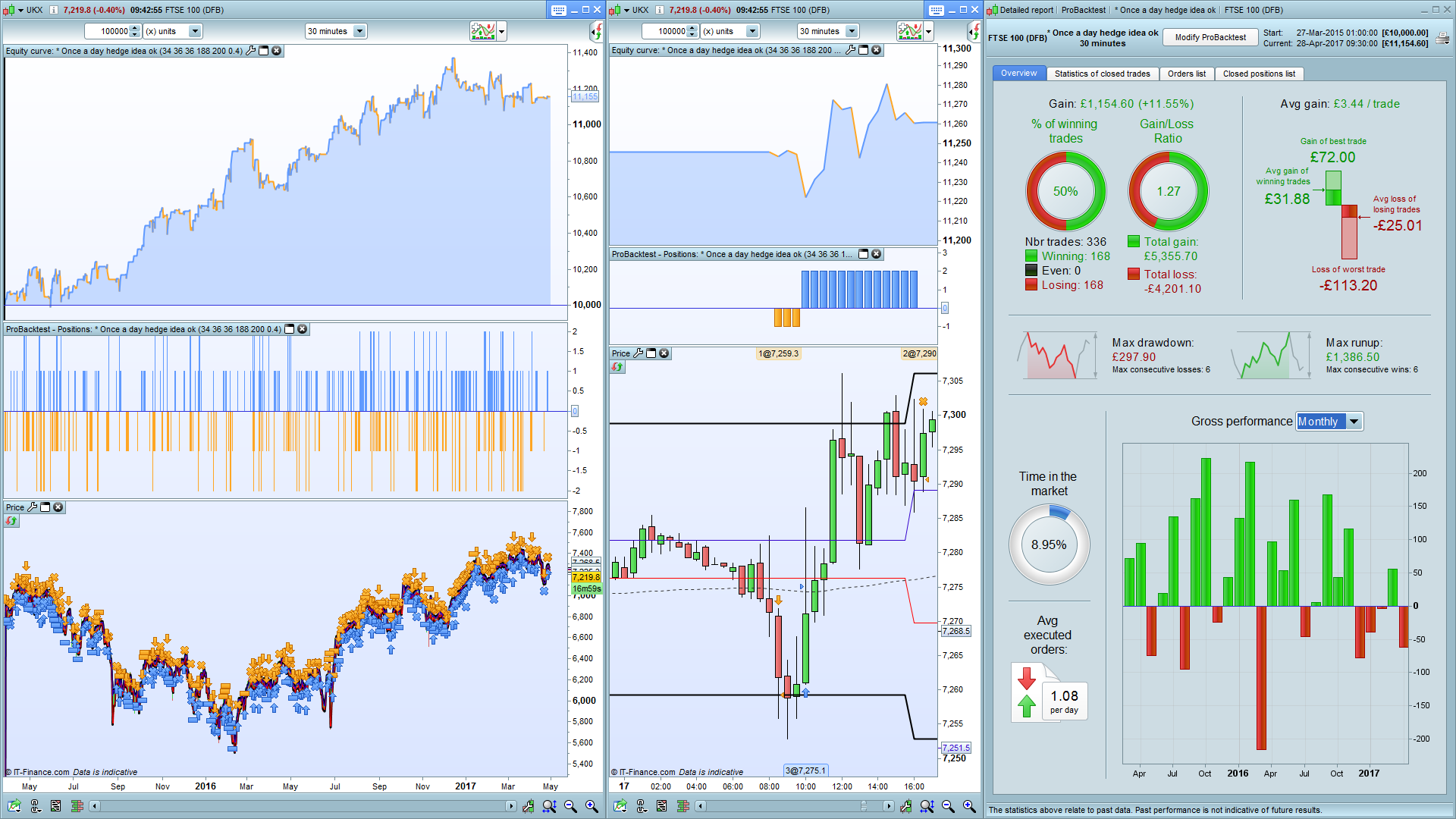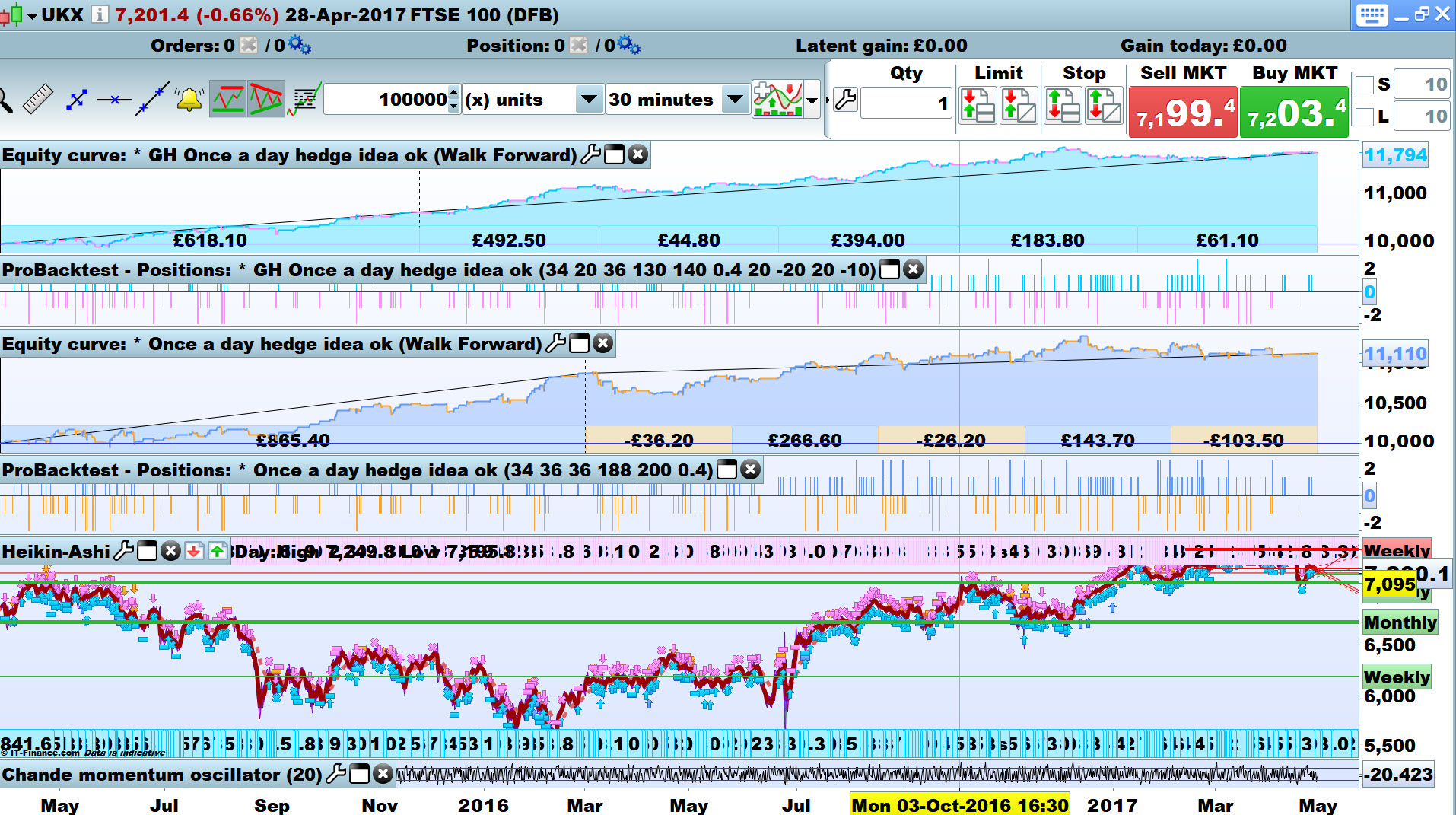 I tested this out on FTSE. On its own the idea doesn’t work. But once you put in a trend filter (in this case long term MA), it starts to become promising. Below is just a quick version I threw together – a skeleton if you like, which gets the orders in the right places according to the rules above – so not finished work by any means.