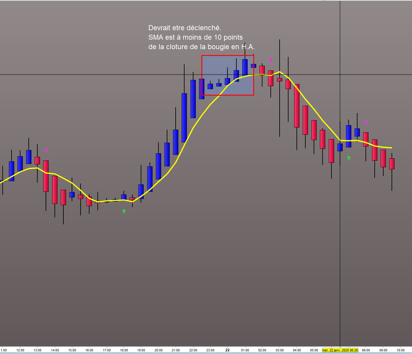 L’idée est bien que la flèche apparaissent lorsqu’elle se situe entre + 10 et – 10 points de la clôture de la bougie H.A + l’autre condition concernant H.A.