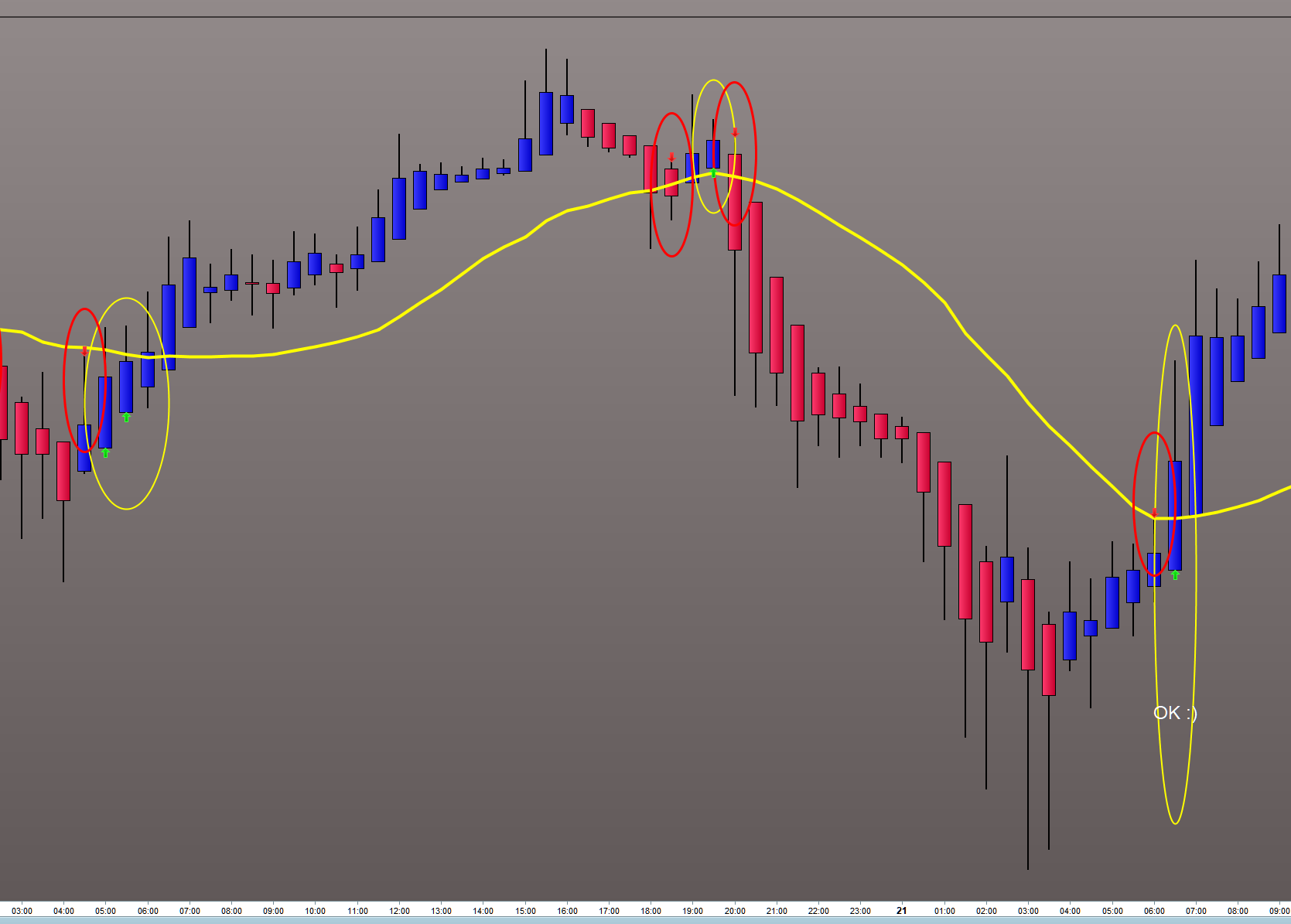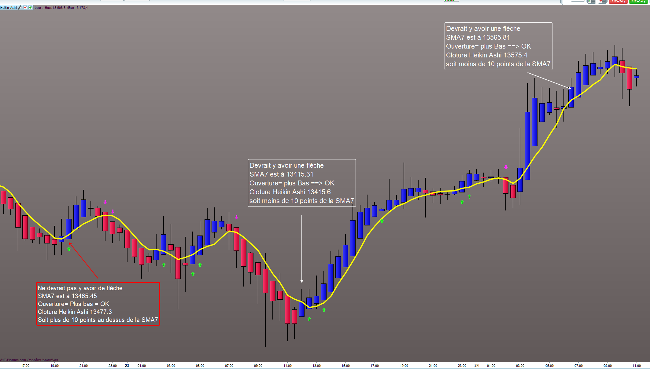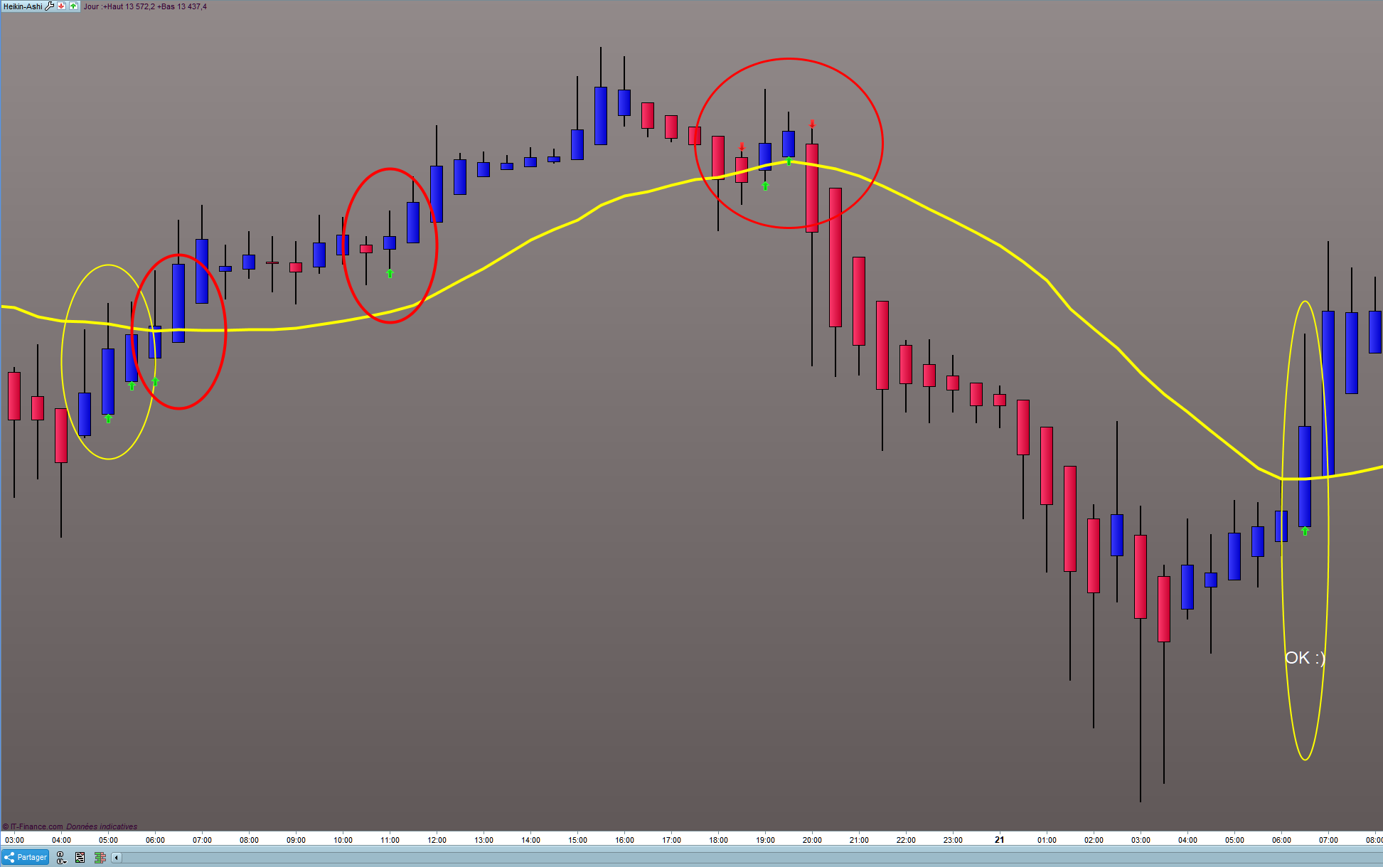 Je cherche (pour le moment sans succès) à obtenir sur un graphique en Heikin Ashi des flèches indiquant lorsque :