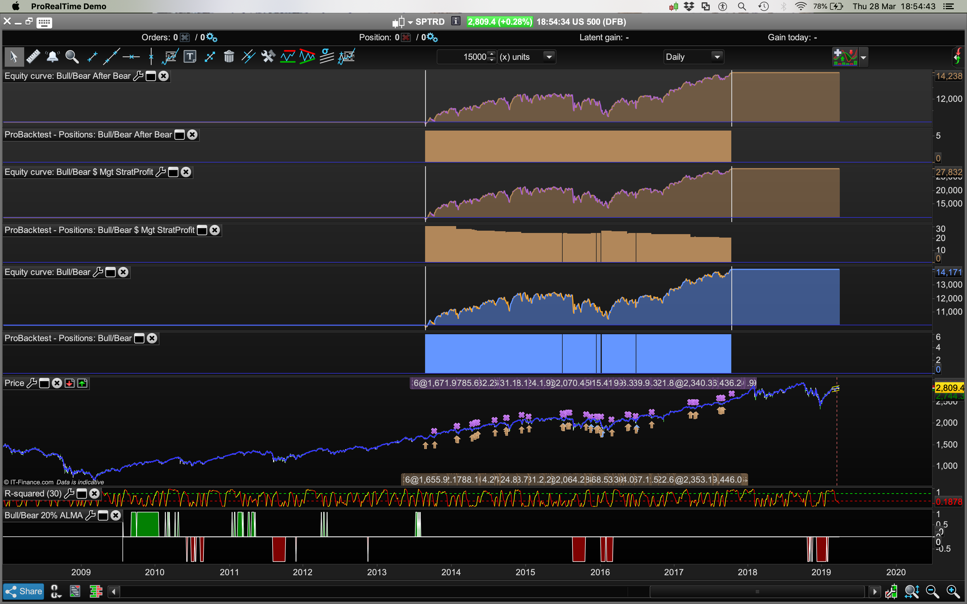 For example after those (short period) red spikes have ended and the indicator has returned to neutral (zero), I would like the system to take a long trade at that point? (Pls see last screenshot). Because there are no “crossovers” I can’t make it do that. I’d also probably program the Buy rules to define a Bear spike as any Bear condition that lasts for less than 5 or maybe 10 days, (depending on backtests), it (the pull backs) appears – at least on observation – to be a great place to enter Long. Similar in concept to what Nicolas coded for me here: https://www.prorealcode.com/topic/how-would-you-create-a-mov-ave-distribution-histogram/#post-92863