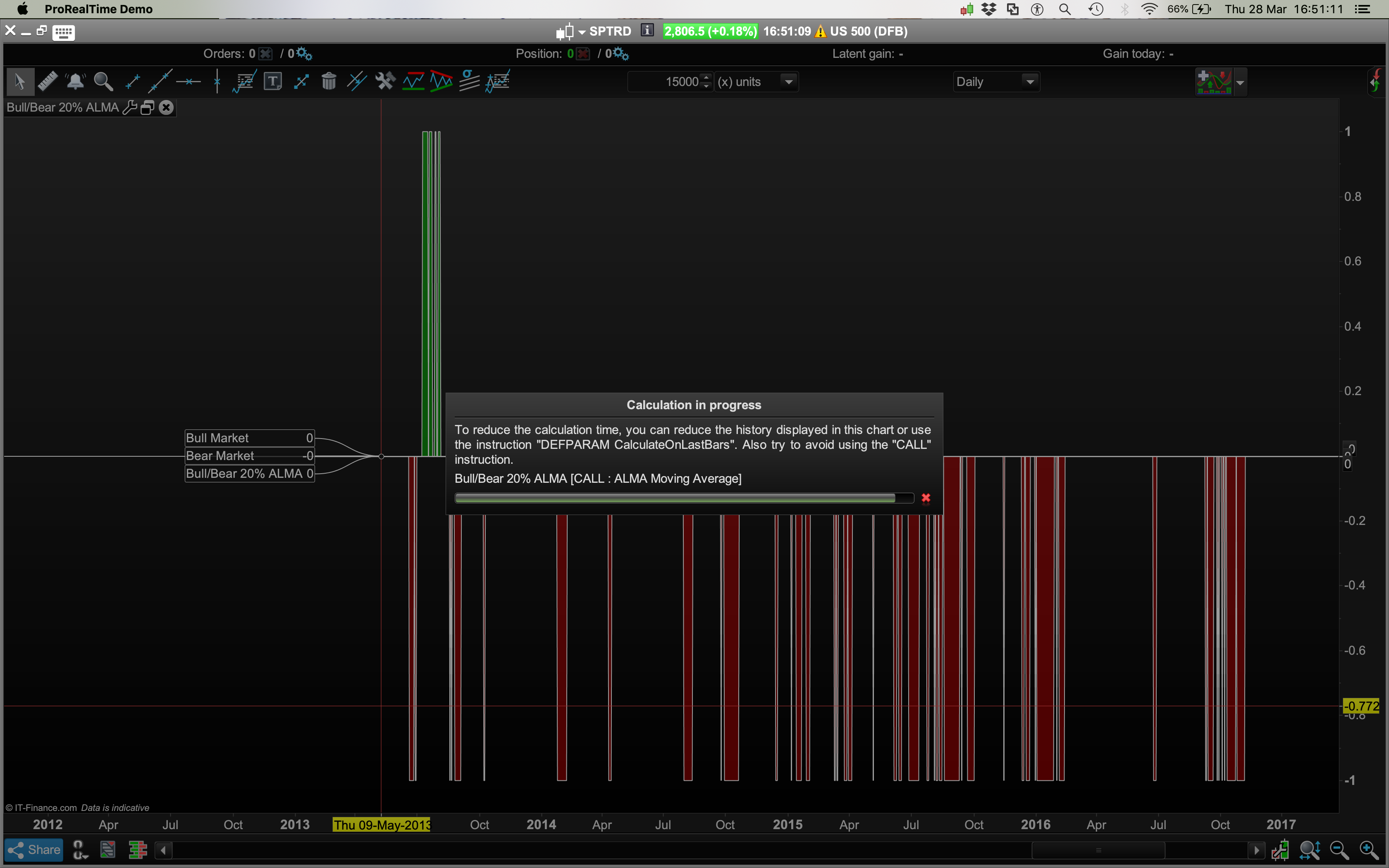 Also it doesn’t like “CALL” as it keeps re-calculating on my 15000 unit chart, even though I added DEFPARAM CalculateOnLastBars = 2000?